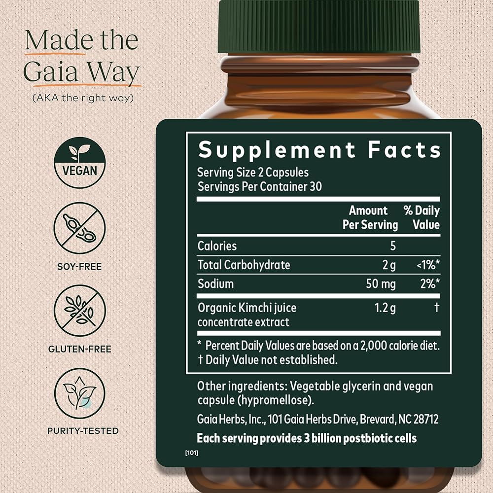 Gaia Herbs Kimchi Postbiotic - مكمل هضمي طبيعي لصحة الأمعاء - مصنوع من الكيمتشي العضوي المخمر - خالي من منتجات الألبان وفول الصويا والغلوتين - 60 كبسولة نباتية (30 حصة)