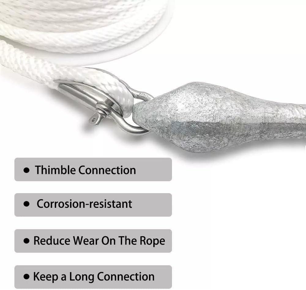 Equipped with a 316 marine-grade stainless steel thimble and shackle, this anchor line ensures superior corrosion resistance and durability. The thimble and shackle make it easy to secure anchors and chains, providing a reliable connection that reduces chafe and spreads the load evenly across the rope.