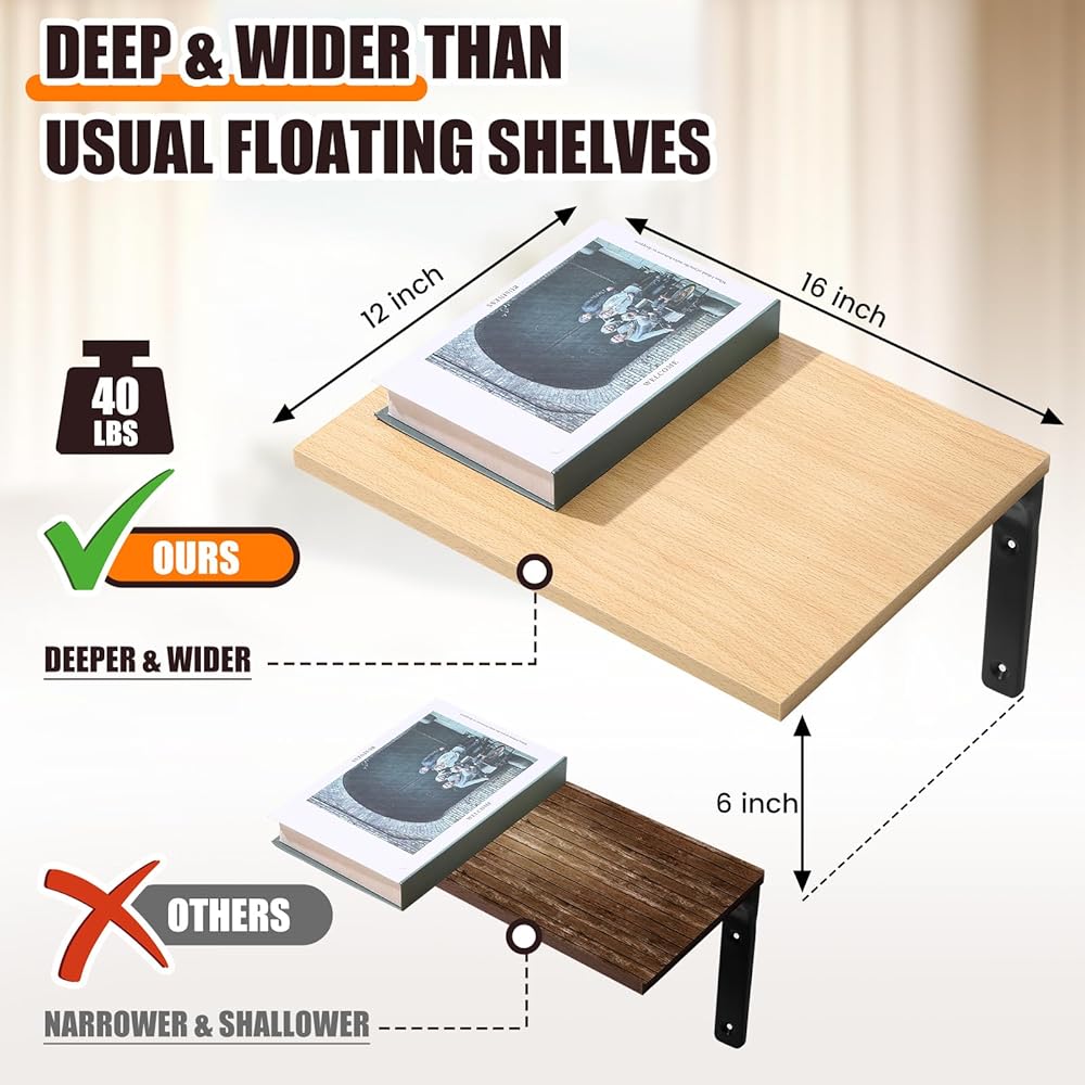 • Deep Floating Shelf: embrace more storage and display space with our 16 inch wide and 12 inch deep floating shelves; Ideal for use as bookshelves, floating nightstands or wall decoration, providing functional storage and organize solution for your items