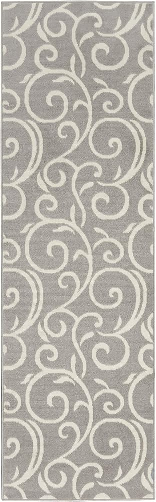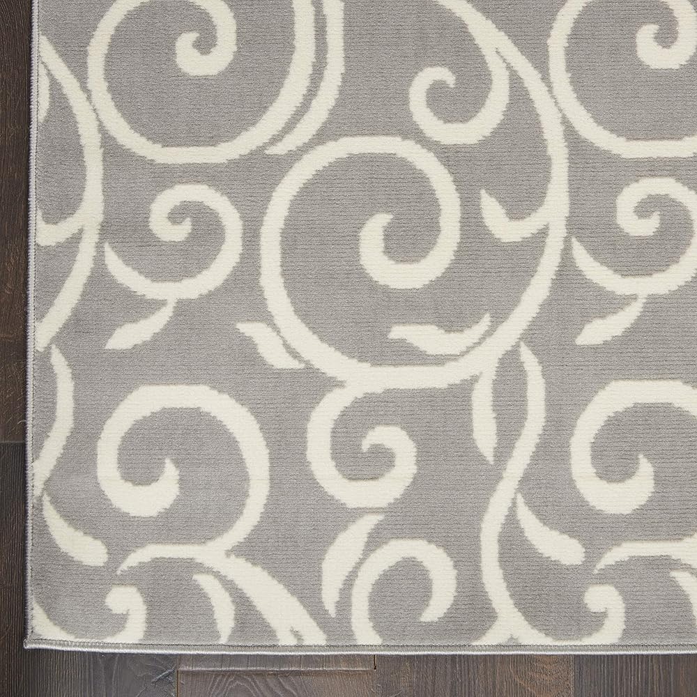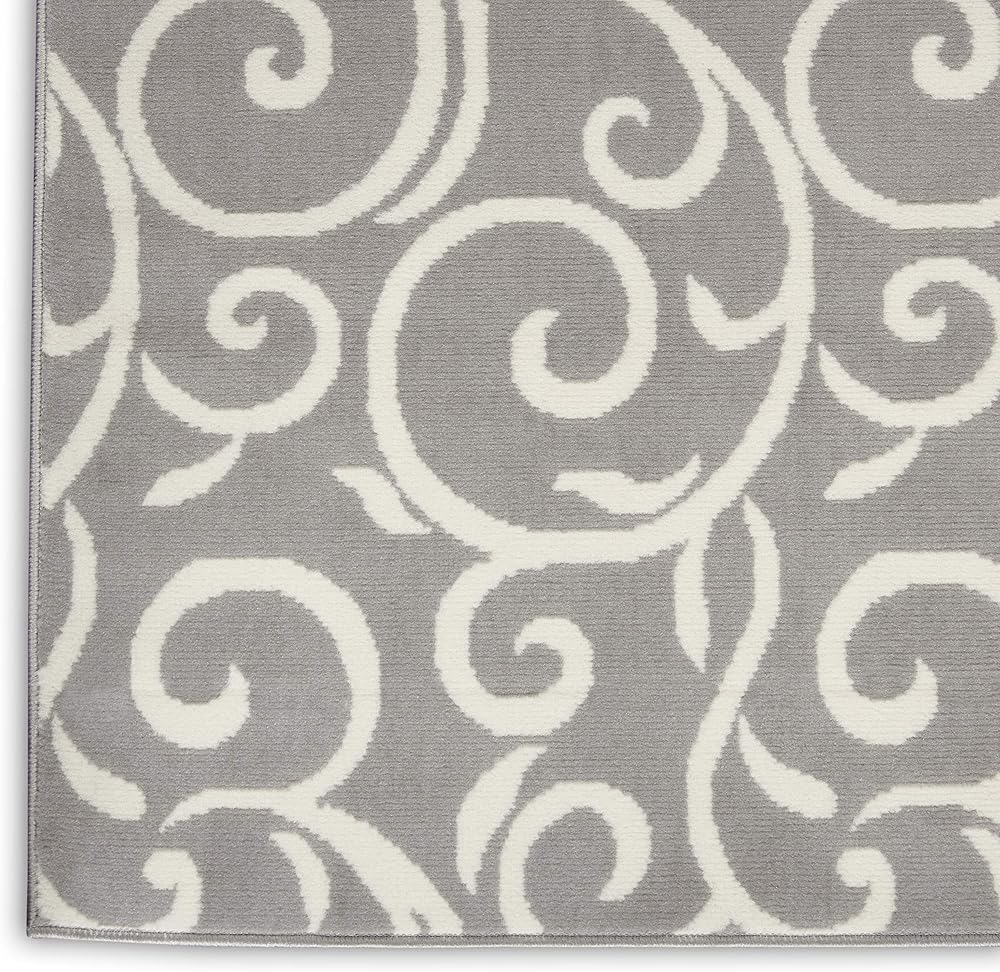Beautifully bold and gorgeously graphic, the Grafix Collection of area rugs from Nourison is destined to deliver a transfixing touch of dramatic appeal to any room. Available in an enthralling array of contemporary color palettes and power-loomed from long-lasting, easy-care polypropylene, each exciting rug is all about outstanding ease and sensational style. Curling vines form a lush abstract garden in this Grafix Collection area rug. This botanical style rug features ivory patterns on a soft grey field, with voluptuous curves creating a statement of soft comfort with artistic flair.