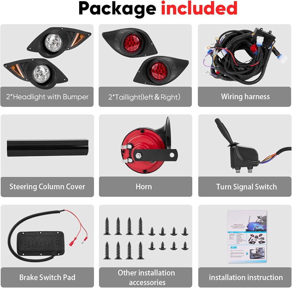 سهلة التركيب - مع تعليمات التثبيت التفصيلية وتصميم التوصيل الأصلي، يعد إعداد مجموعة مصابيح عربة الجولف Yamaha G29 أمرًا سهلاً. فقط تأكد من توصيل أسلاك البطارية بشكل صحيح للحصول على إعداد سلس. إذا واجهت أي مشاكل، فلا تتردد في التواصل معنا
