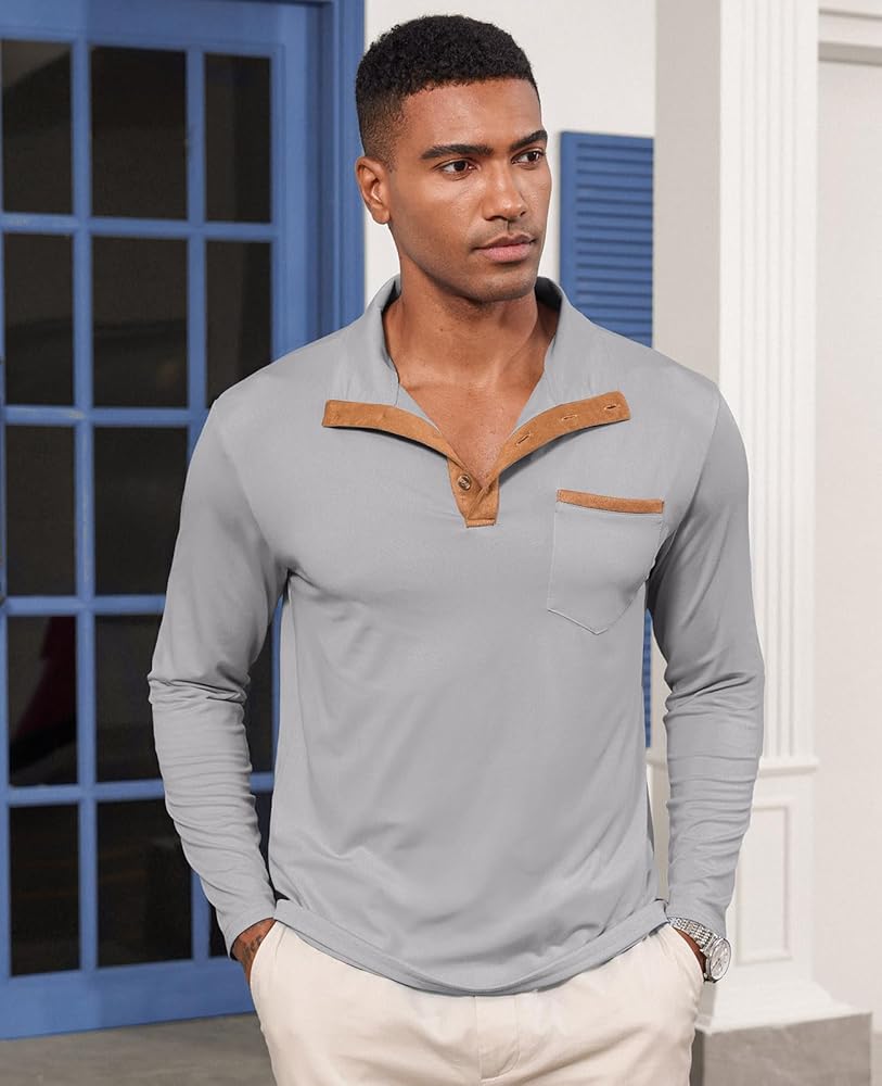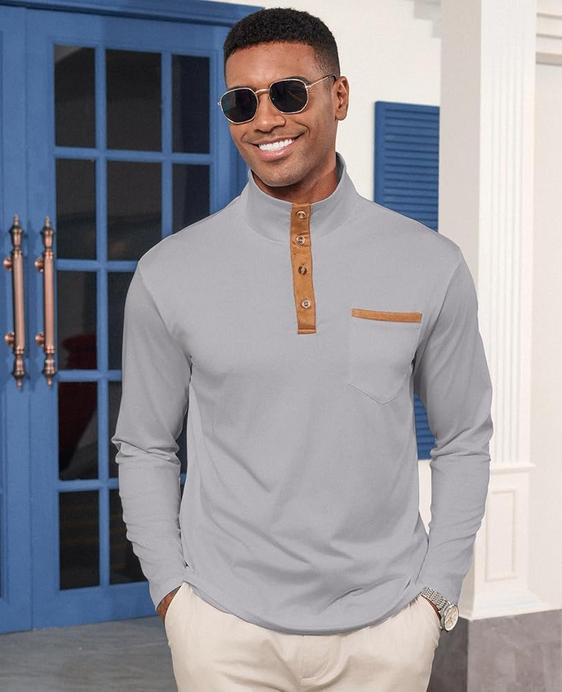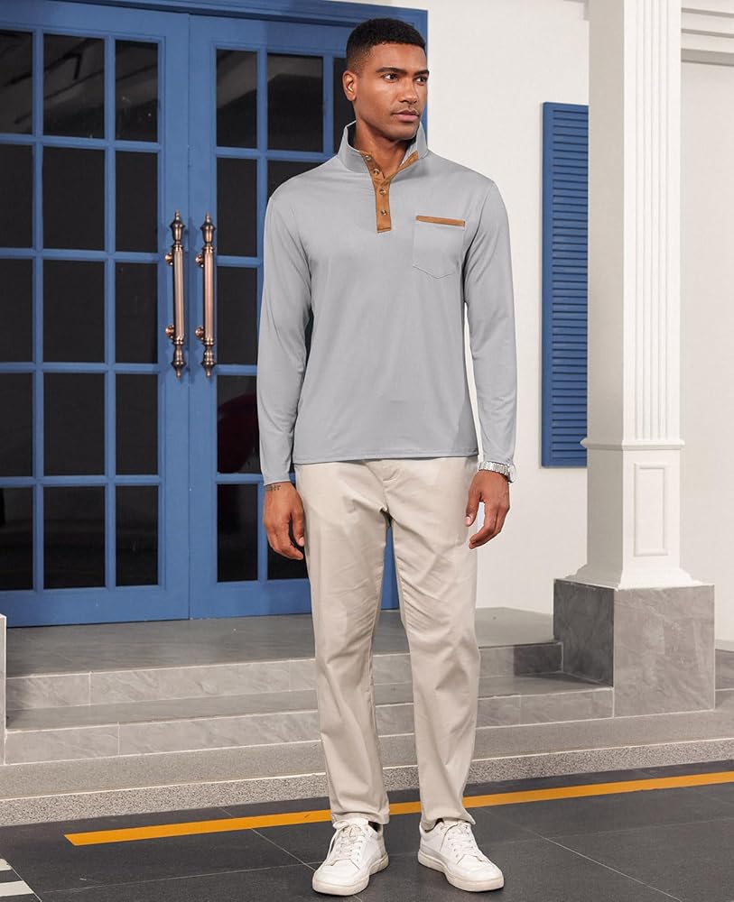 • 【الخامة: 95% بوليستر، 5% سباندكس. قميص هينلي رجالي طويل الأكمام مصنوع من نسيج محبوك ناعم وخفيف الوزن ومسامي وصديق للبشرة، مناسب للارتداء اليومي أو العمل.
