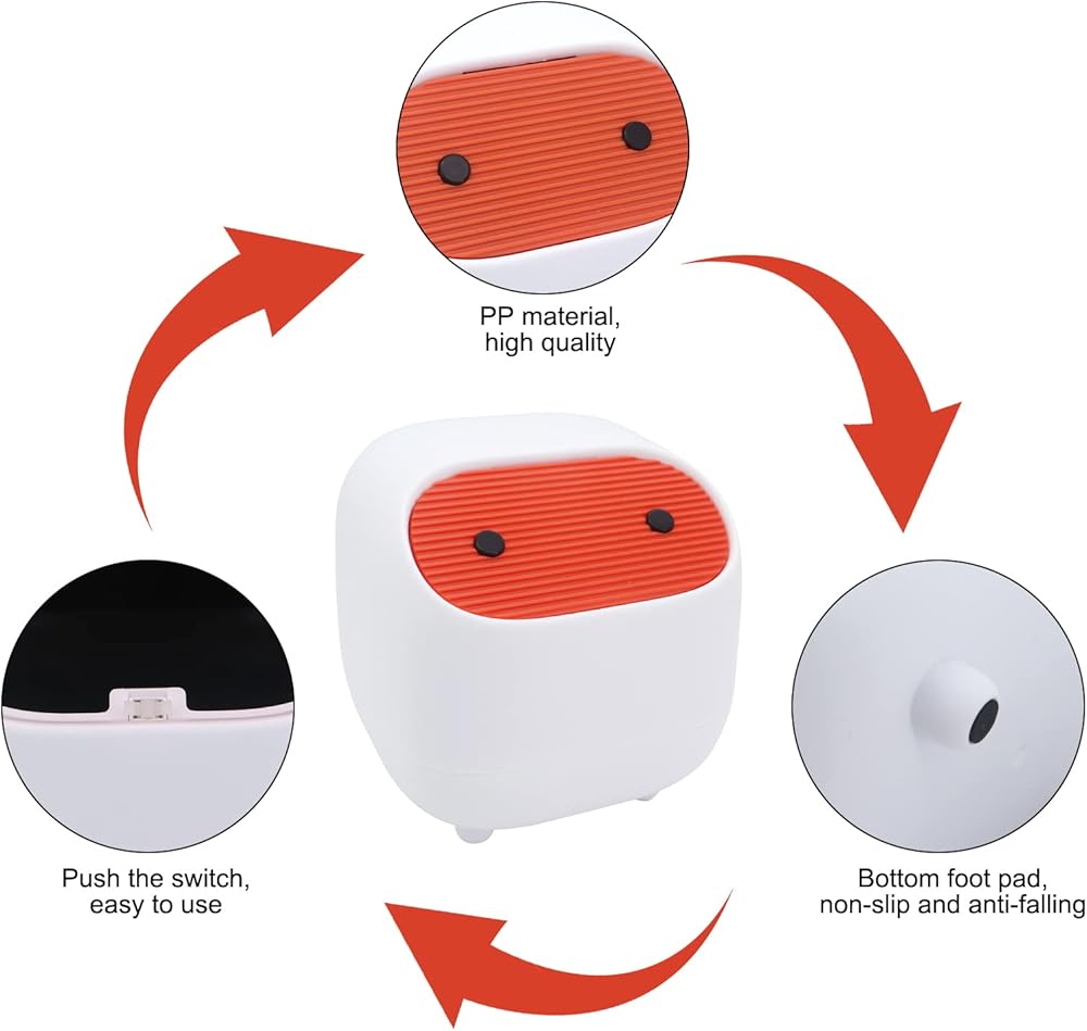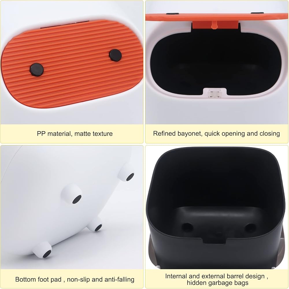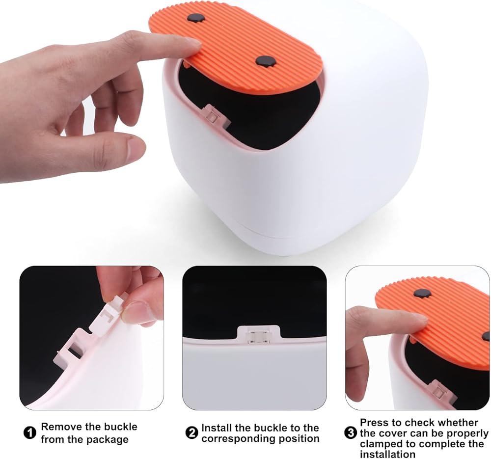【Desk trash can】:Push button small trash can, suitable for storing paper towels, food, cosmetics and other small trash, it can effectively isolate the smell of trash, fruit flies and keep the countertop tidy. One-touch closure, clean and odourless. (Note: There is a clasp in the bag of the bin, which must be snapped in the corresponding hole so that the lid can close properly.)