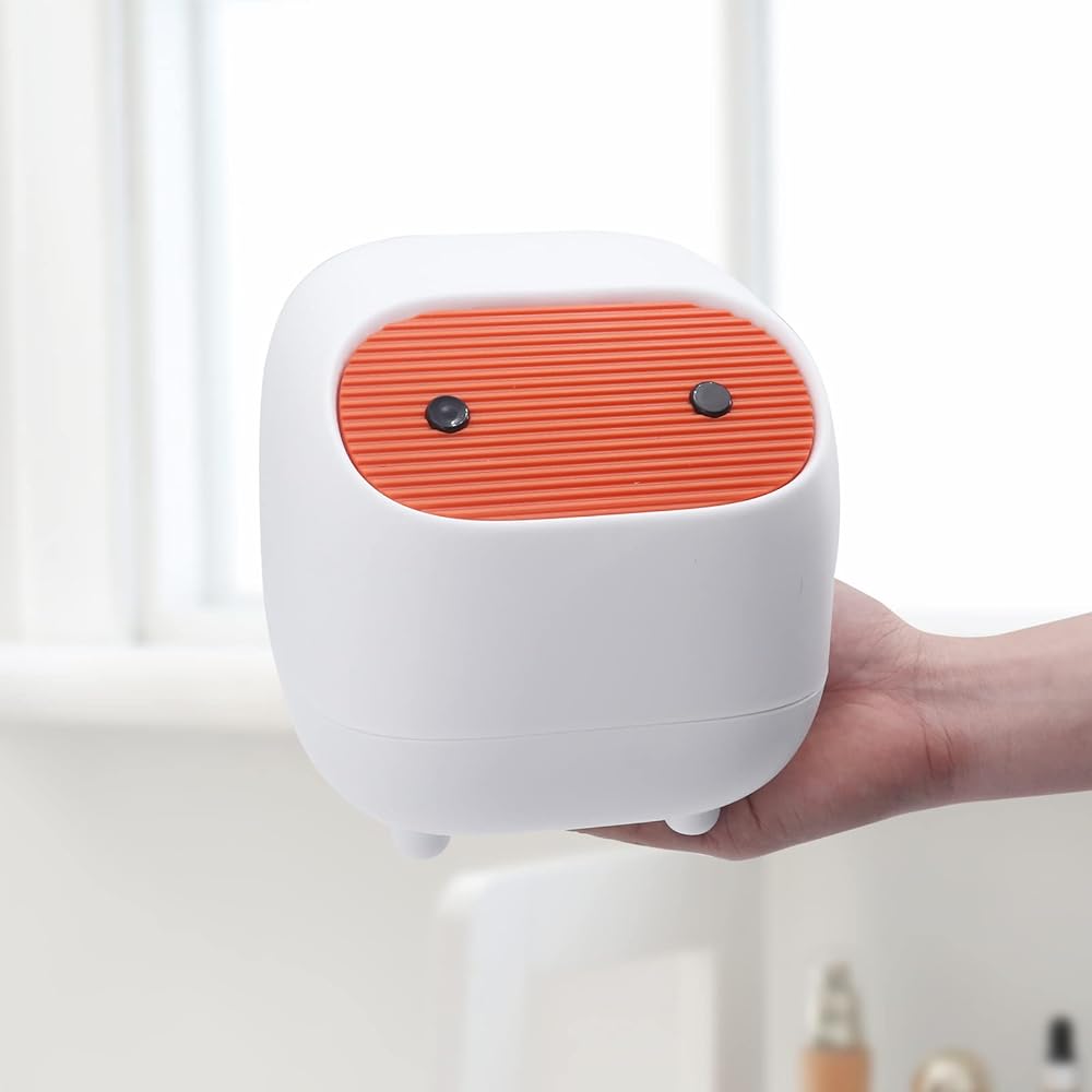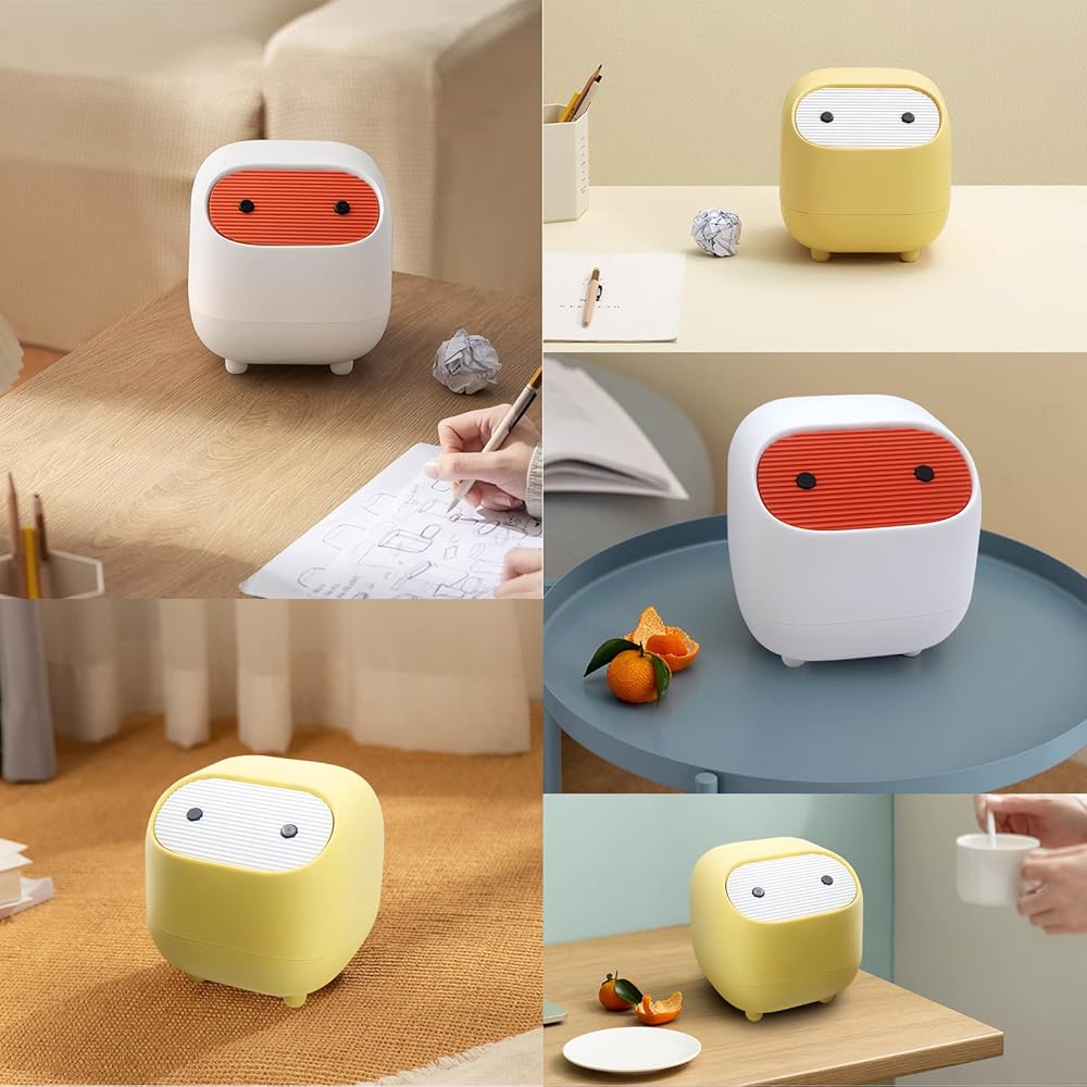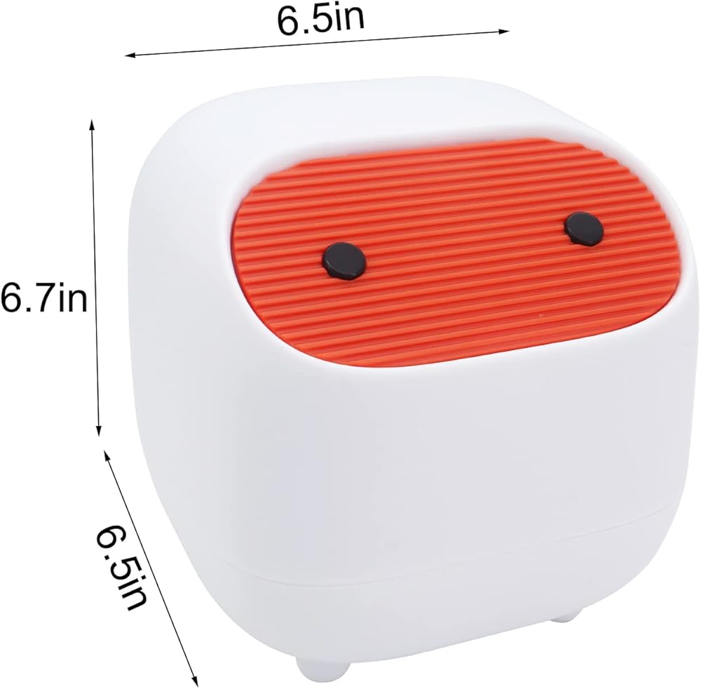 【Mini size】:Trash can with lid measures: 6.7 "W x 6.5 "D x 6.5 "H. The compact shape moves freely. Ideal for desks, kitchen table tops, coffee tables, dressers, bedside tables, etc. It can also store cosmetics and toiletries and keep the counter top neat and tidy.