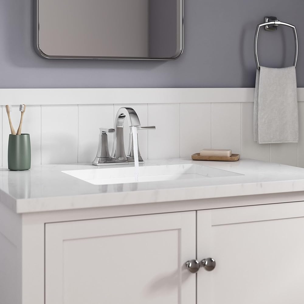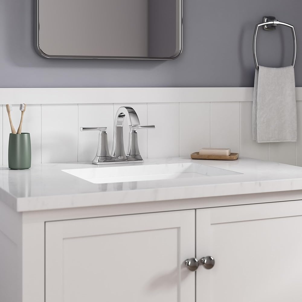 The Belmeade Two-Handle Centerset Bathroom Faucet from American Standard is a stately design with defined edges, a gently curved spout and sturdy lever handles. This 3-hole faucet adds impressive style to the smaller bathroom sink or vanity and is easy to install for a quick update. The Belmeade 4-in. centerset faucet promises drip-free performance, lasting beauty, and reliability.