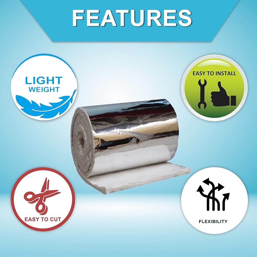 عزل مقاوم للحريق: بطانية عازلة من ألياف السيراميك عالية الجودة مدعومة برقائق ألومنيوم قوية بسمك 50 ميكرون هي بطانية عالية المقاومة للحرارة وغير قابلة للاحتراق، مصنفة حتى 2400 درجة فهرنهايت (على جانب صوف السيراميك للبطانية، وليس على الجانب من رقائق الألومنيوم المرفقة) ويبلغ مقاسها 2.54 سم × 60.96 سم × 6.20 قدم. الحجم والكثافة 8 رطل / قدم 3