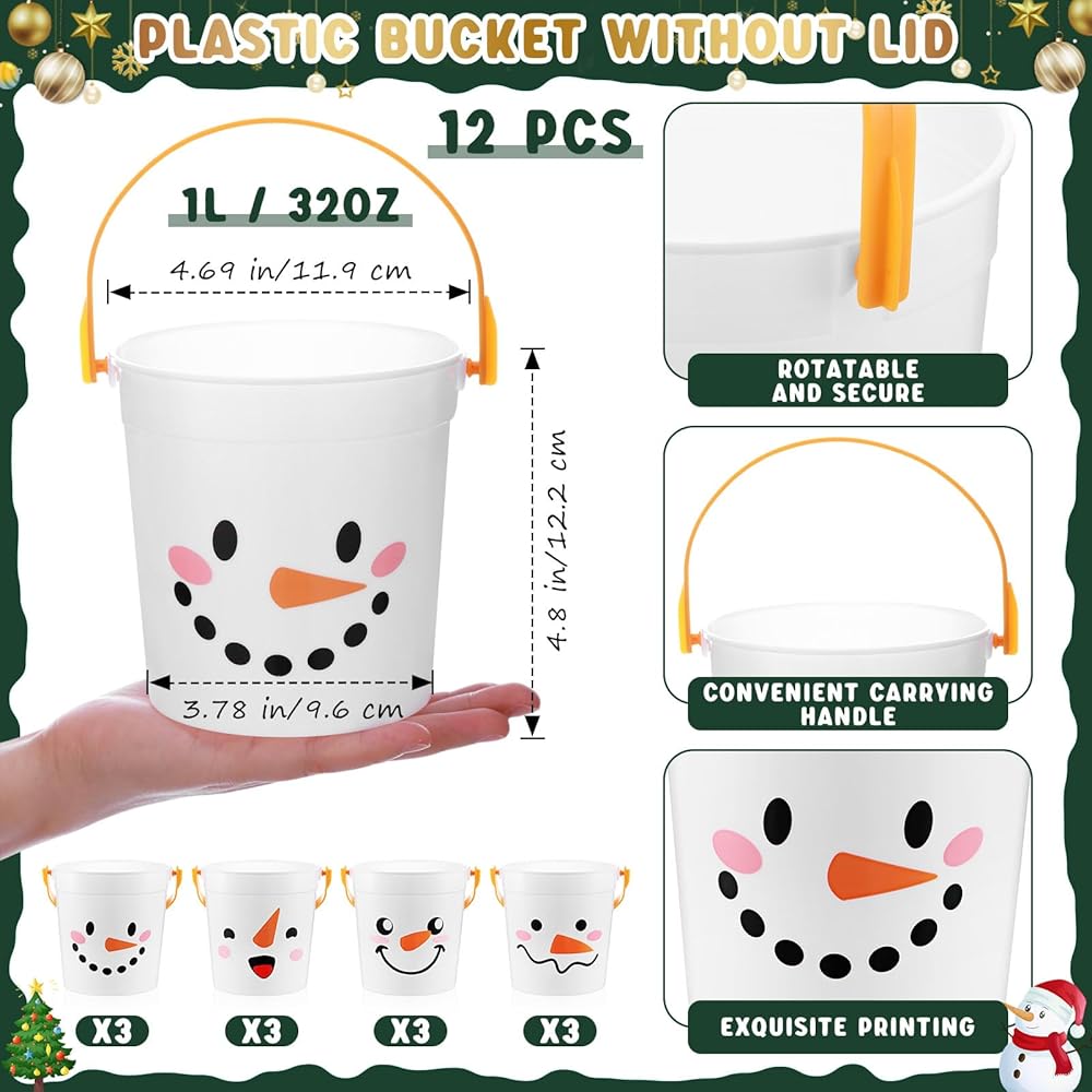 meekoo 12 حزمة دلاء بلاستيكية لعيد الميلاد مع مقابض 4.69 × 3.78 × 4.8 بوصة دلاء رجل ثلج عيد الميلاد للهدايا، سلال حلوى عيد الميلاد اللطيفة، سلال ألعاب منزلية لمستلزمات حفلات عيد الميلاد
