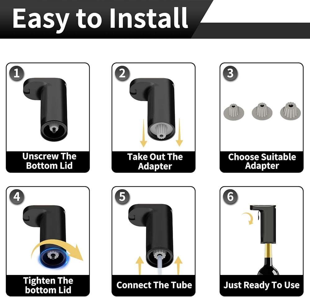 • تناسب معظم الزجاجات: مضخة تهوية النبيذ بثلاثة أحجام مختلفة من المحول، وطولين مختلفين من أنابيب السيليكون، يمكن أن تتكيف مع معظم الأحجام المختلفة لزجاجات النبيذ المتوفرة في السوق، مثل النبيذ الأحمر والأبيض والويسكي والشمبانيا والبراندي وما إلى ذلك.