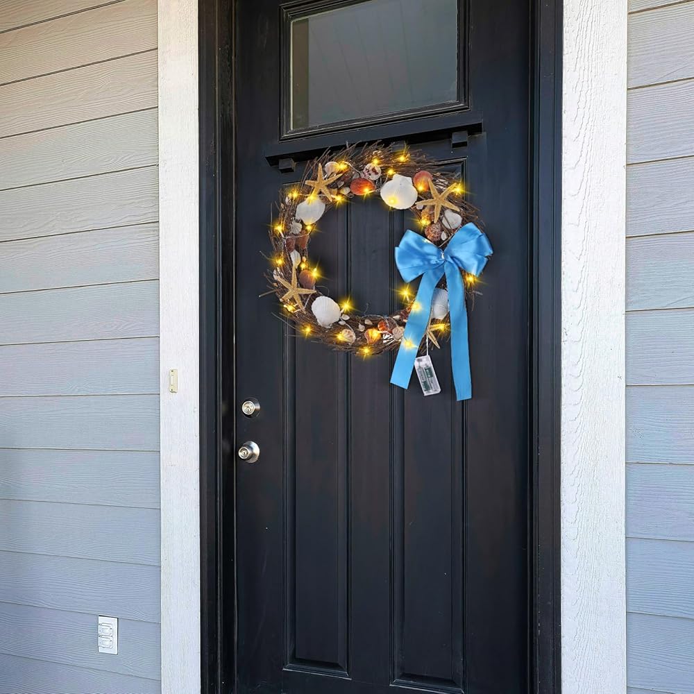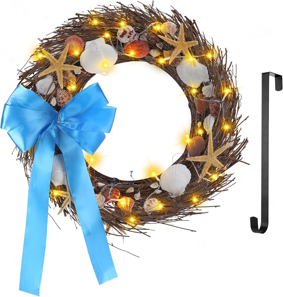 إكليل الشاطئ الساحلي من Dingion مضاء بصدف الصيف 20 بوصة إكليل طبيعي محفوظ للباب الأمامي مع أضواء LED وخطاف إكليل من قذائف نجم البحر الساحلي للداخلية والخارجية والربيع والصيف ديكور المنزل