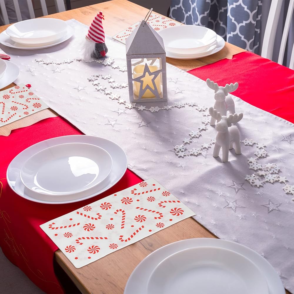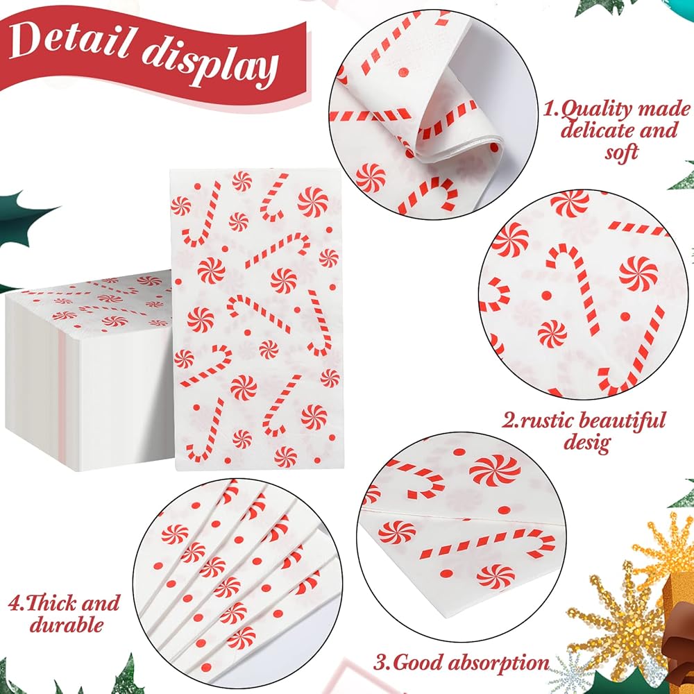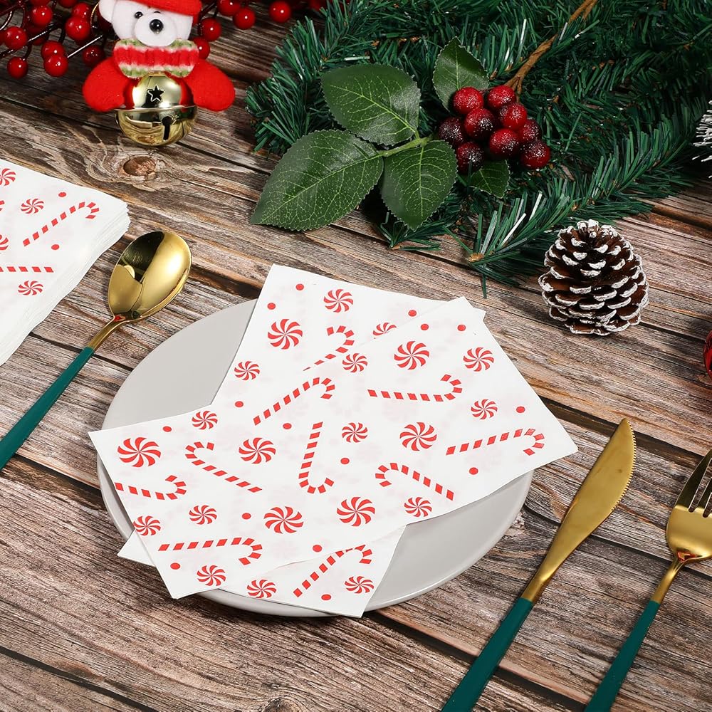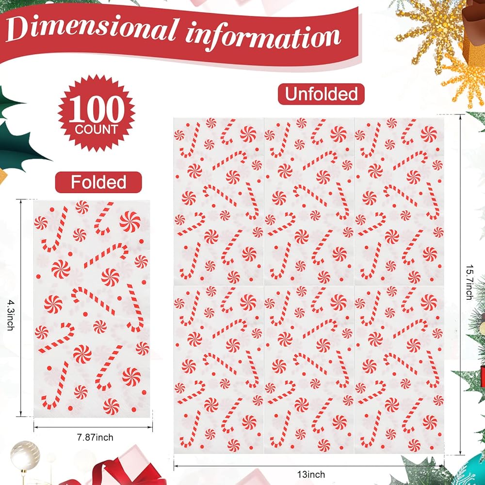 محتوى العبوة: سوف تحصل على 100 قطعة من المناديل ذات طابع حلوى عيد الميلاد إجمالاً، كمية كافية يمكن أن تلبي مستلزمات حفلات عيد الميلاد الخاصة بك واحتياجات الديكور، وإضافة مظهر جميل لحفلة عيد الميلاد الخاصة بك أو التجمع معًا