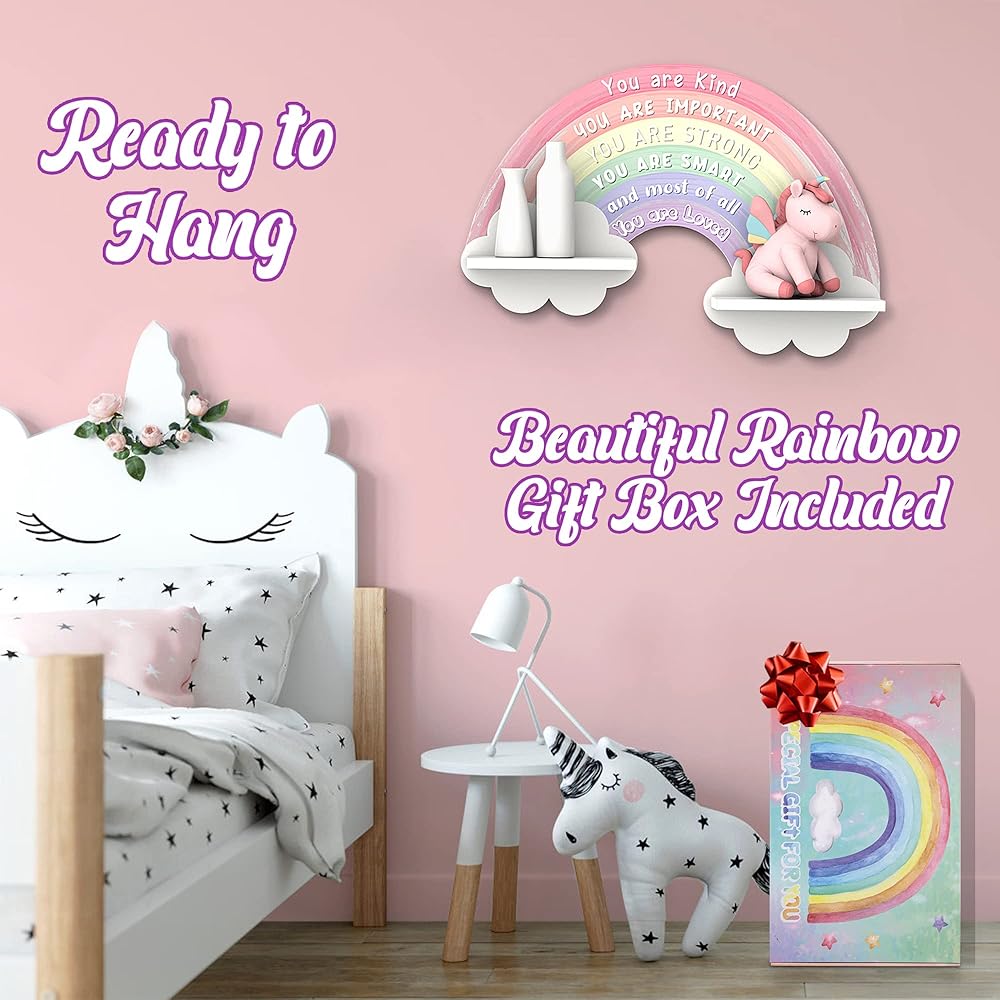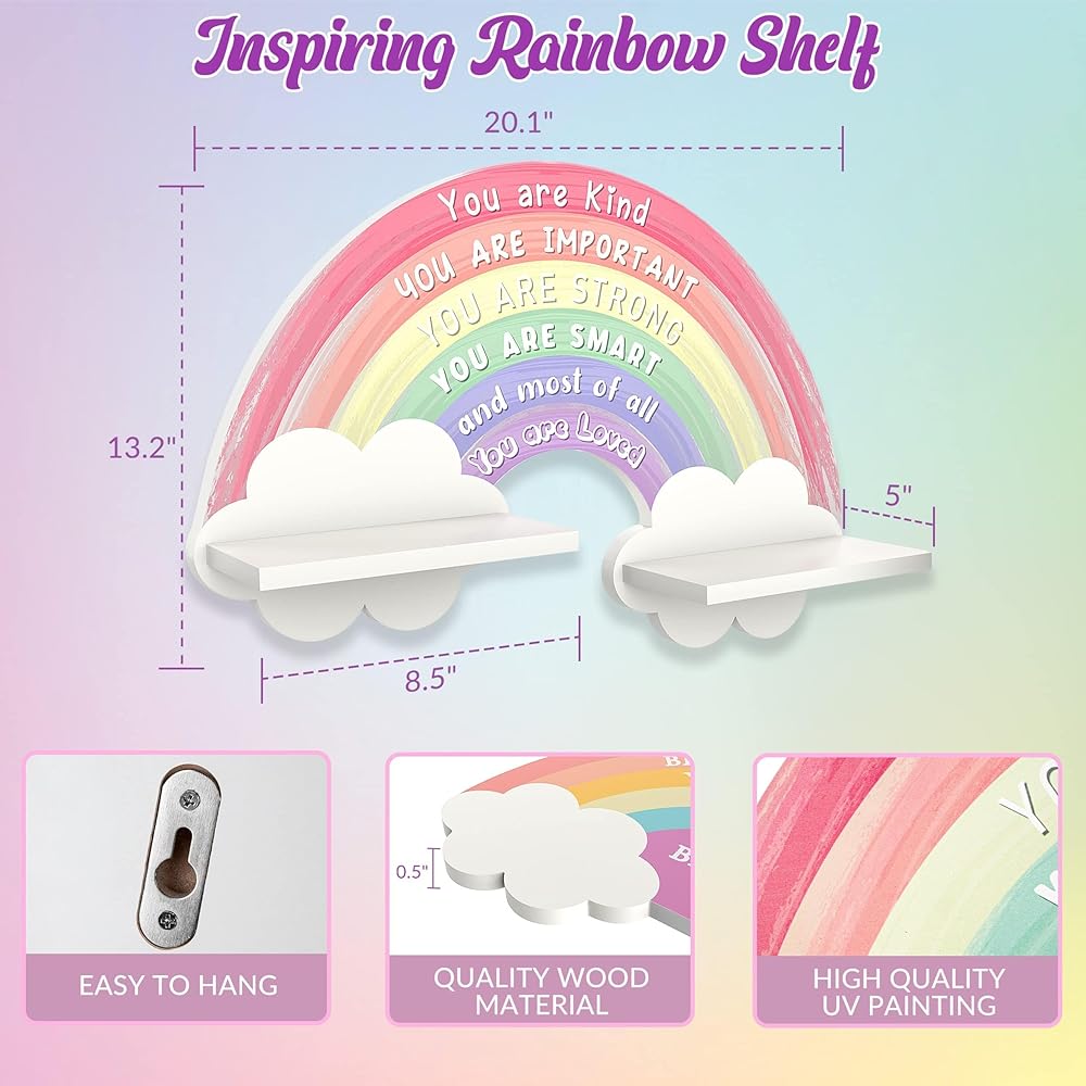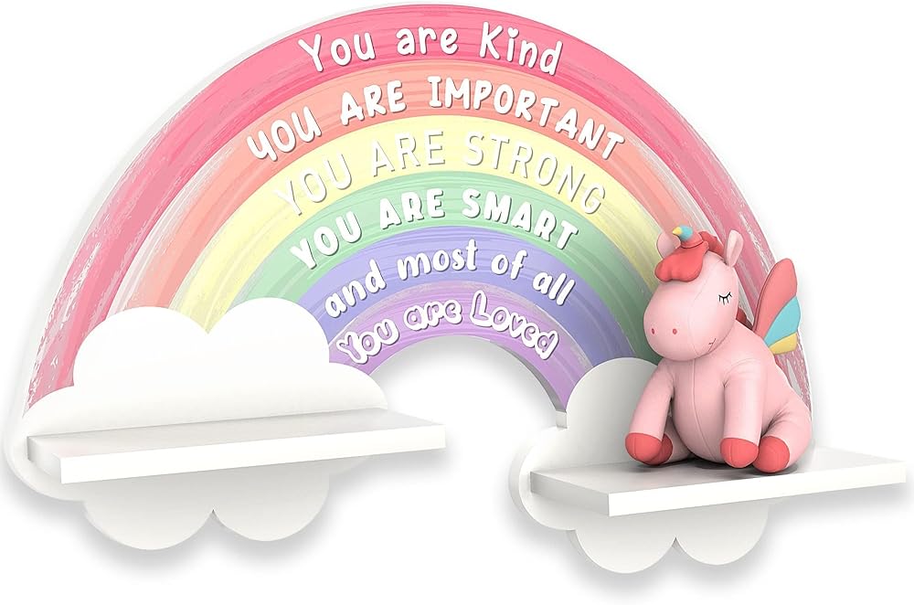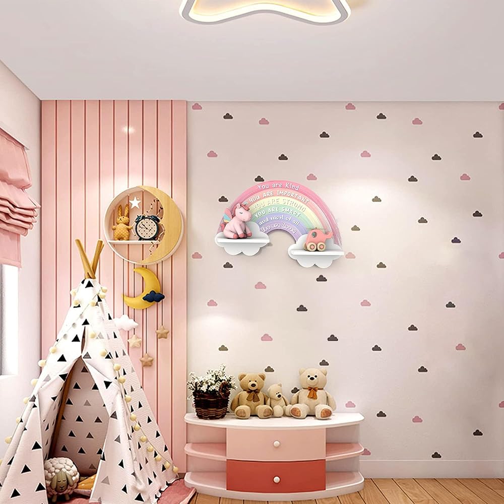 🌈ديكور حائط ملهم بألوان قوس قزح - كل طبقة لها لون فريد وكلمات تأكيد إيجابية. اجعل غرفة أطفالك مليئة باللمسة الإيجابية. تعمل ديكورات الحائط الفريدة من نوعها بألوان قوس قزح على تحسين الغرفة وتوفر القدر المناسب من مساحة الرف لتلك الأشياء الصغيرة. سوف تحب عرض ألعابها الثمينة على الرف.