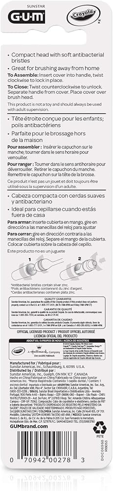 The GUM Crayola Travel toothbrush encourages a thorough clean while on-the-go. The compact head is designed for small mouths and the extra soft bristles are gentle on gums and remove dental plaque and food particles. Patented coating helps the brush stay cleaner between uses, and the ventilated cap helps keep brush head clean and protected when packed for travel.