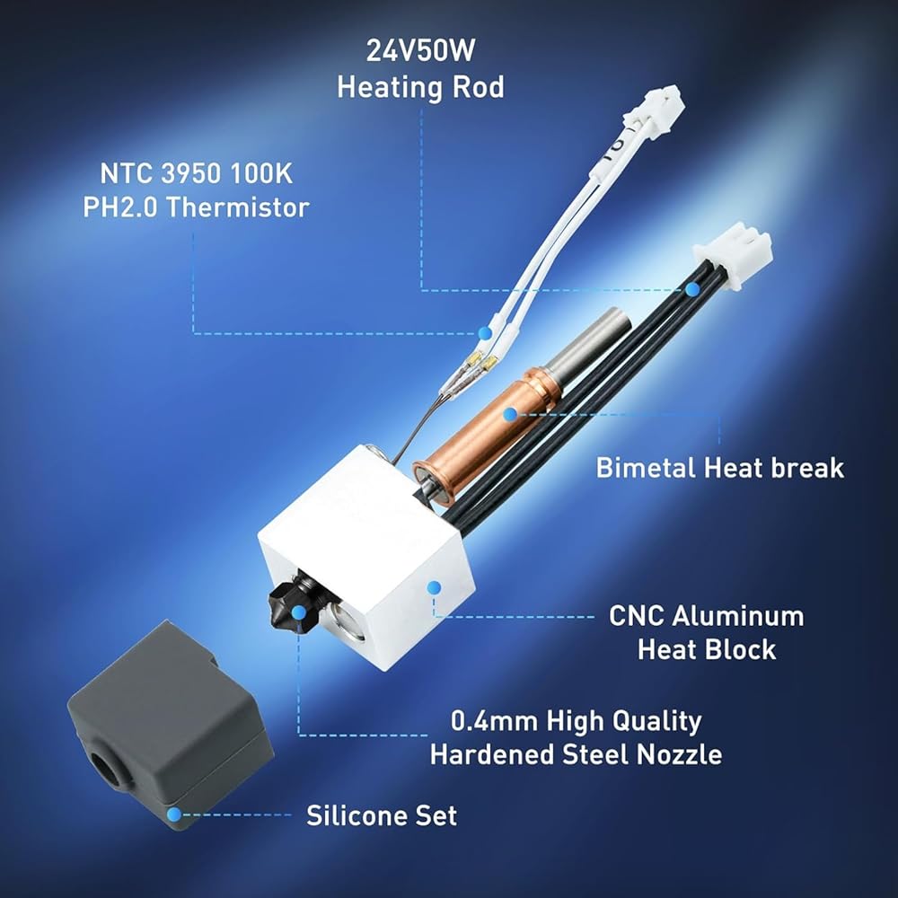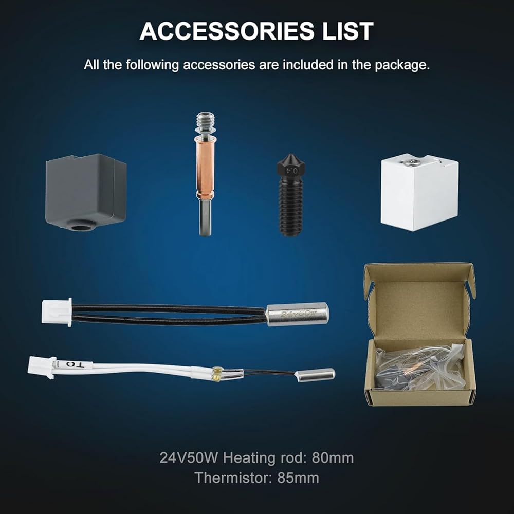 تتضمن العبوة فوهة صلبة 0.4 مم + فوهة نحاسية 0.4 مم + غلاف سيليكون + مجموعة واحدة من مجموعة الأطراف الساخنة (خرطوشة السخان، الثرمستور، درع الحرارة، الحلق، الفوهة، غلاف السيليكون)