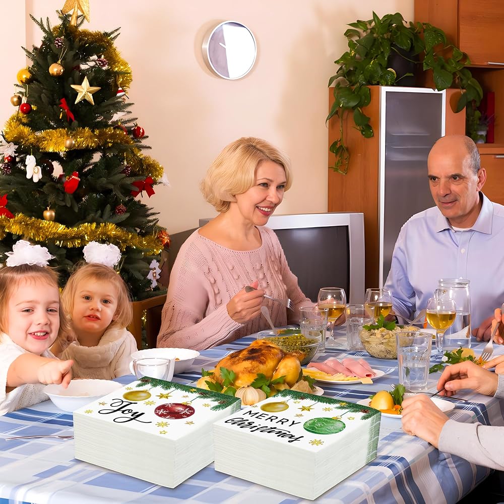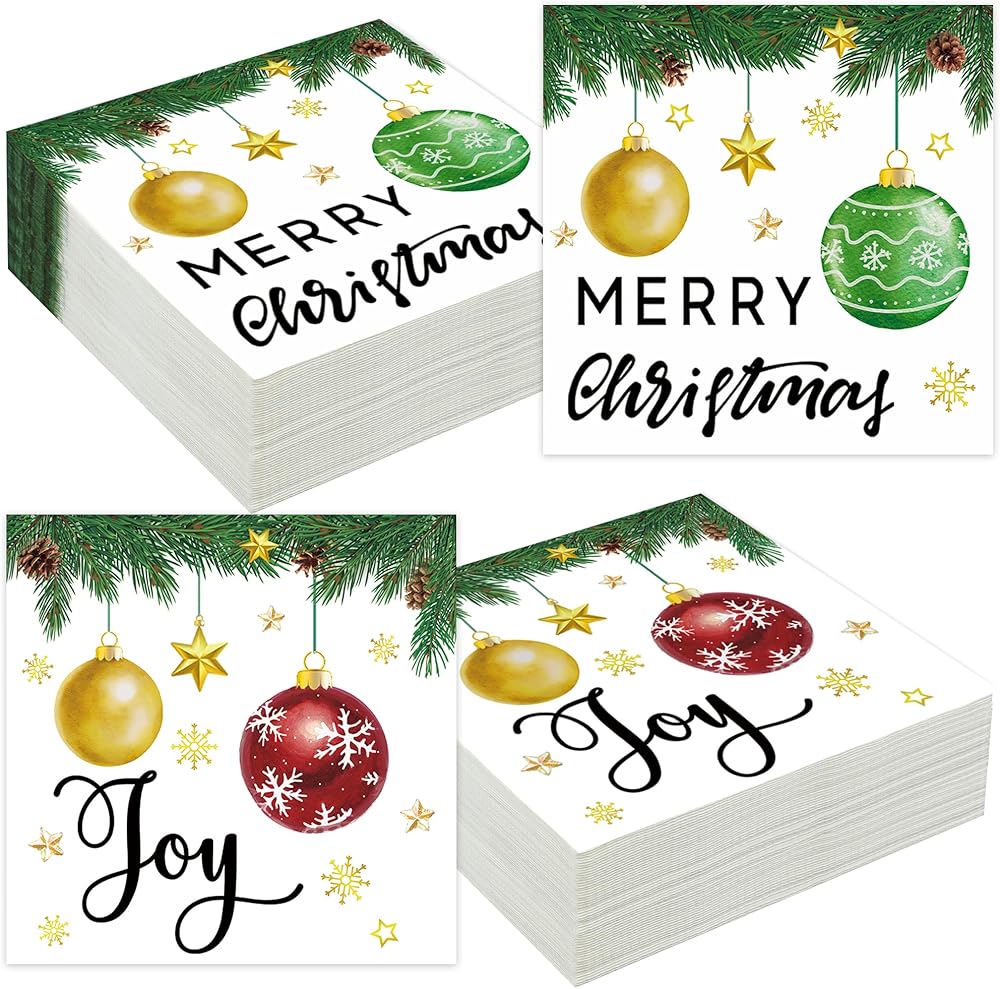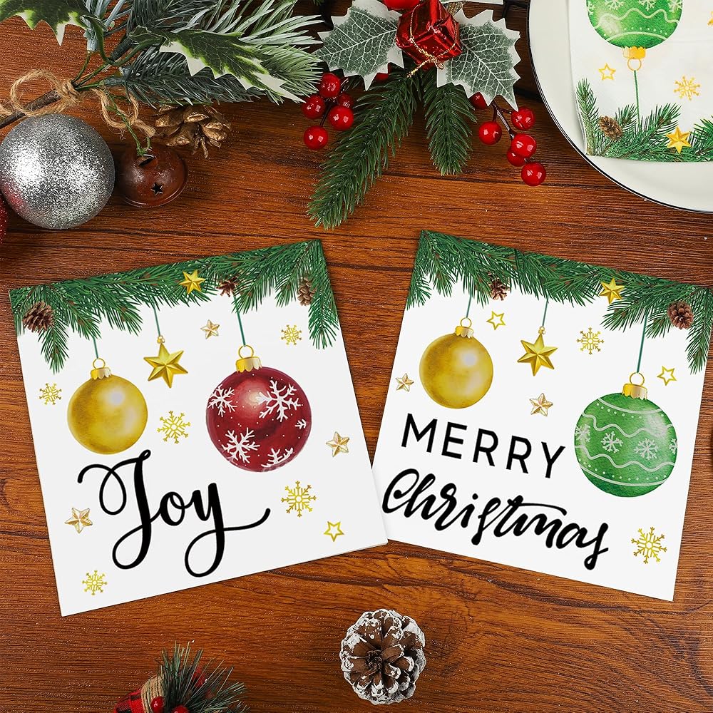 Exquisite Christmas elements: Our Christmas disposable napkins are printed with different patterns on the two sides, using delicate red and green Christmas ball, pine leaves and pine cones patterns and paired with the words "Merry Christmas" and "Joy" to create a rich Christmas atmosphere; make your party even more glamorous.