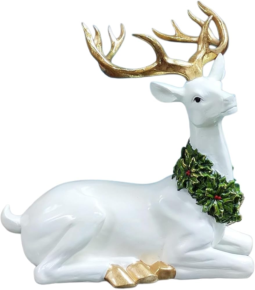 Embrace the elegance of the season with the Moments in Time 18.5"H Gold Antler Standing Reindeer with Wreath – a masterpiece that exudes timeless sophistication. Crafted from hand-painted resin, this regal reindeer mimics the delicate allure of ceramic. Adorned with gold antlers and hooves, this majestic creature stands in a dignified pose, adding a touch of grace to your holiday decor. The pièce de résistance is the green wreath delicately embellished with berries, dusted in an enchanting golden sparkle – a symbol of refined festive charm. Elevate your space with this artful blend of sophistication and holiday spirit, creating an atmosphere of dignified celebration. Additionally, we've made gifting simple for you. This item comes in Moments in Time's special gift packaging, meaning it's ready to be presented to someone special without the need for extra wrapping. It's convenience and thoughtfulness, all in one. Dimensions: 12.2” x 8.66" x 18.5”