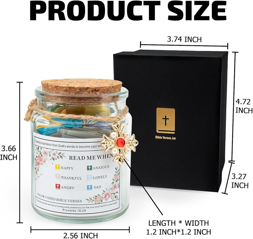 أحجام جرة الكتاب المقدس: جرة آية الكتاب المقدس زجاجة الفلين: 3.5 * 2.6 * 2.6 بوصة؛ ورق الكتاب المقدس ذو 6 ألوان: 90 قطعة؛ ملصقات الكتاب المقدس: 5.1 * 1 بوصة، صندوق هدايا تذكارية رائع: 4.7 * 3.1 * 3.5 بوصة، عناصر سوداء، لون ناضج ومستقر وأنيق