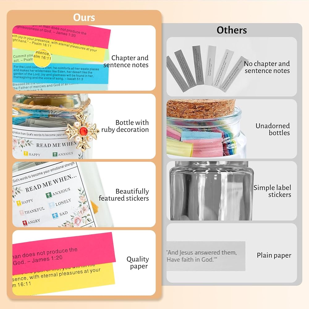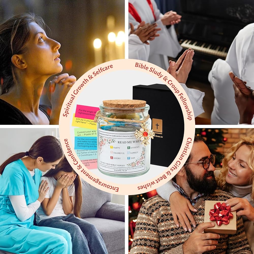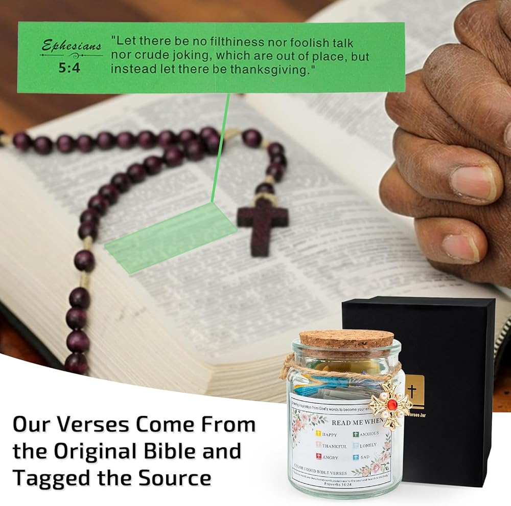 تغذية الروح: تحتوي جرة آية الكتاب المقدس الخاصة بنا على مجموعة منسقة بعناية مكونة من 90 آية من الكتاب المقدس تشمل مجموعة واسعة من المشاعر والمشاعر. سواء كنت تبحث عن الراحة أو الإلهام أو التشجيع، ما عليك سوى إخراج بطاقة مطوية من الجرة الزجاجية واغمر نفسك بكلمات الله ويسوع الحكيمة. دع هذه الكتب المقدسة تملأ قلبك وترشدك من أعماق روحك