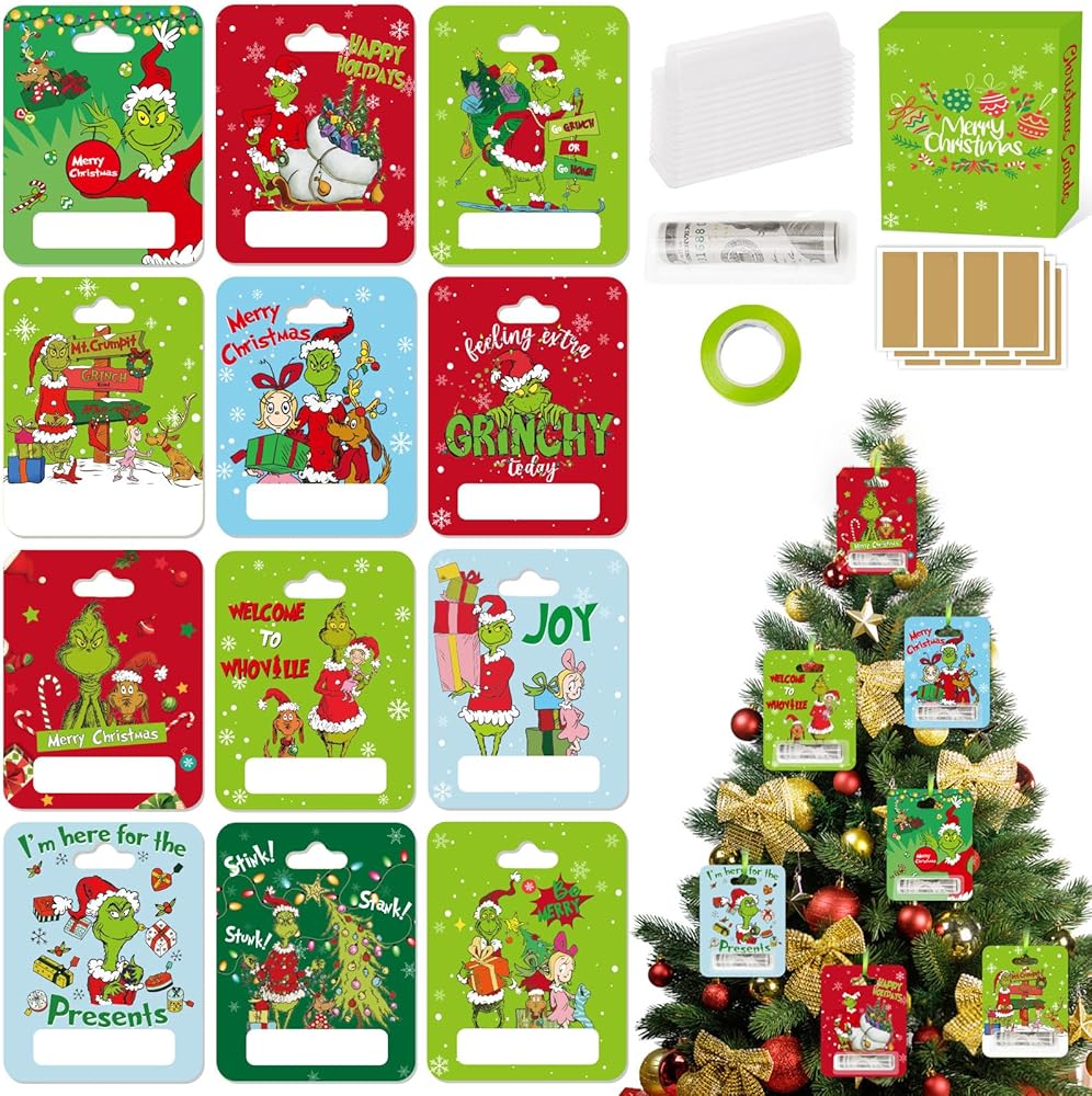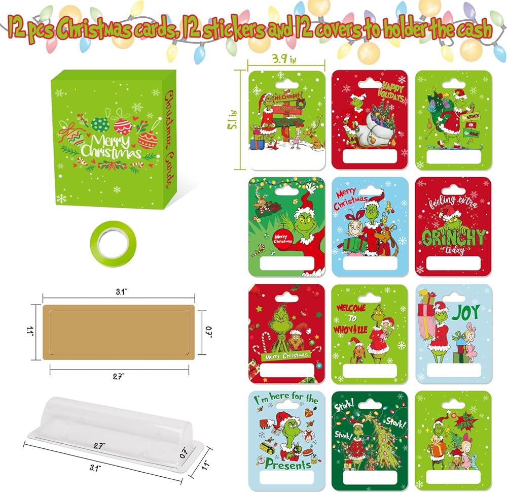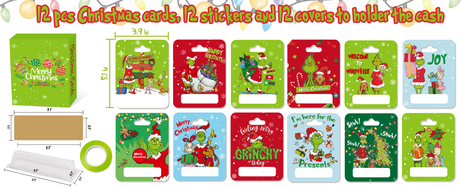 • مجموعة حامل أموال عيد الميلاد: تتضمن العبوة القيمة 12 بطاقة أموال عيد الميلاد، و12 ملصقًا لاصقًا، و12 غطاءًا بلاستيكيًا لتأمين النقود، وشريط أخضر ملفوف للتعليق. يبلغ مقاس كل بطاقة 5.1x3.9 بوصة، وجميعها معبأة في صندوق لسهولة التخزين