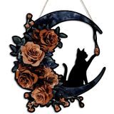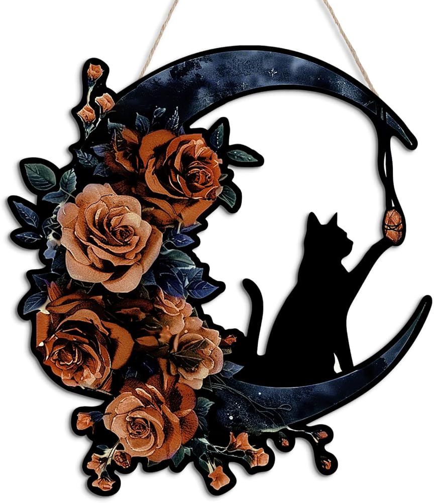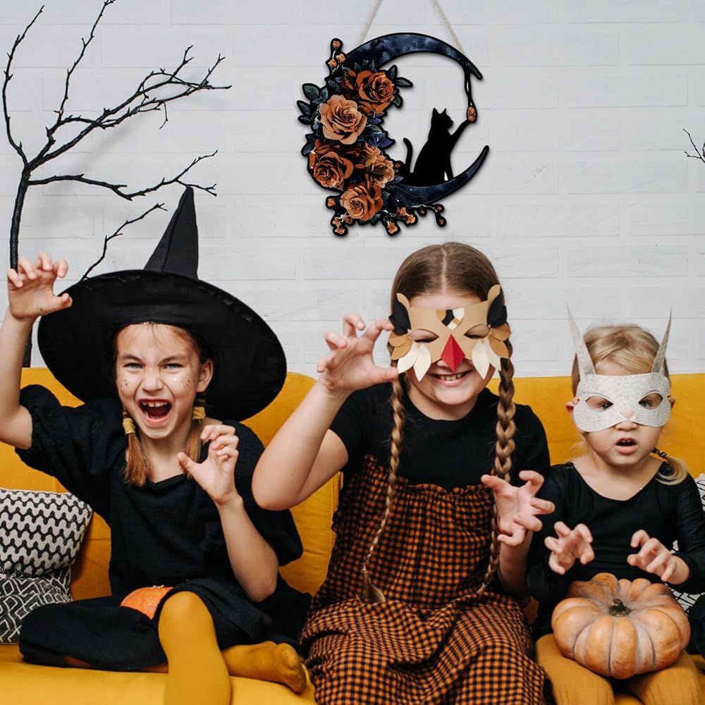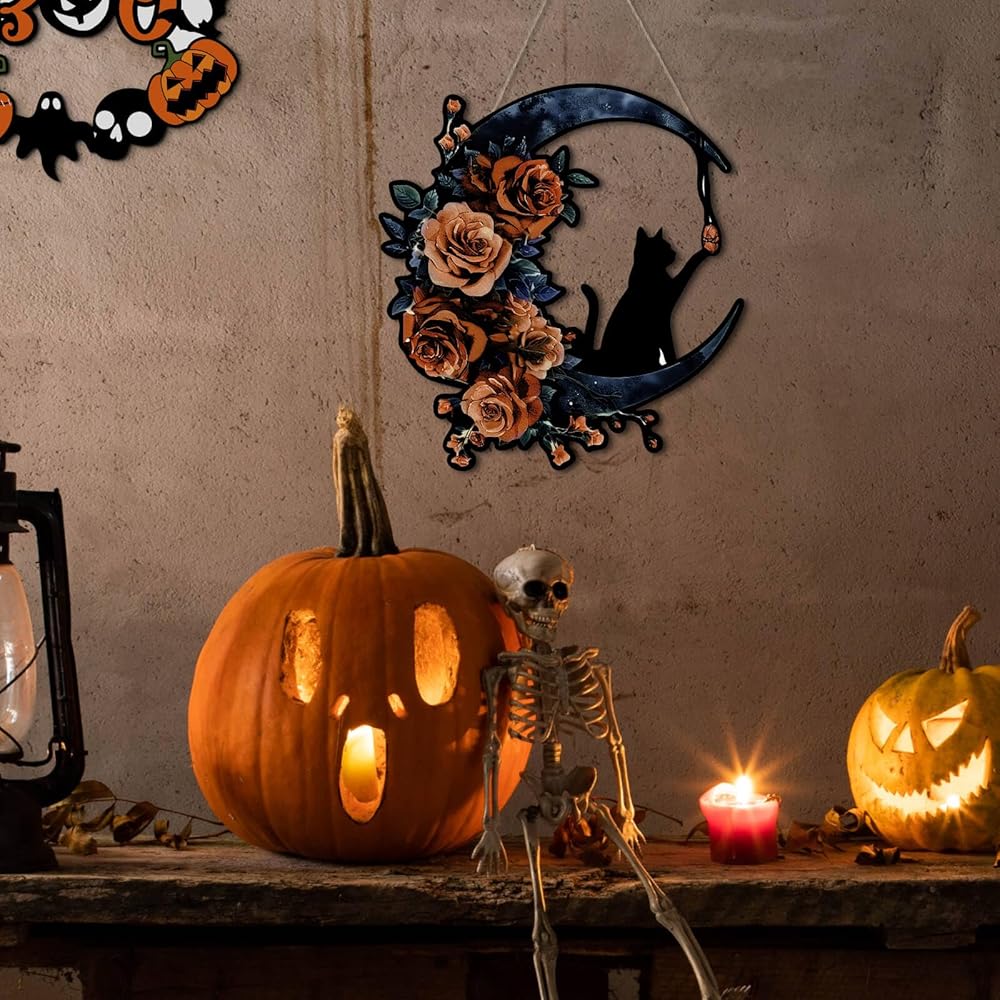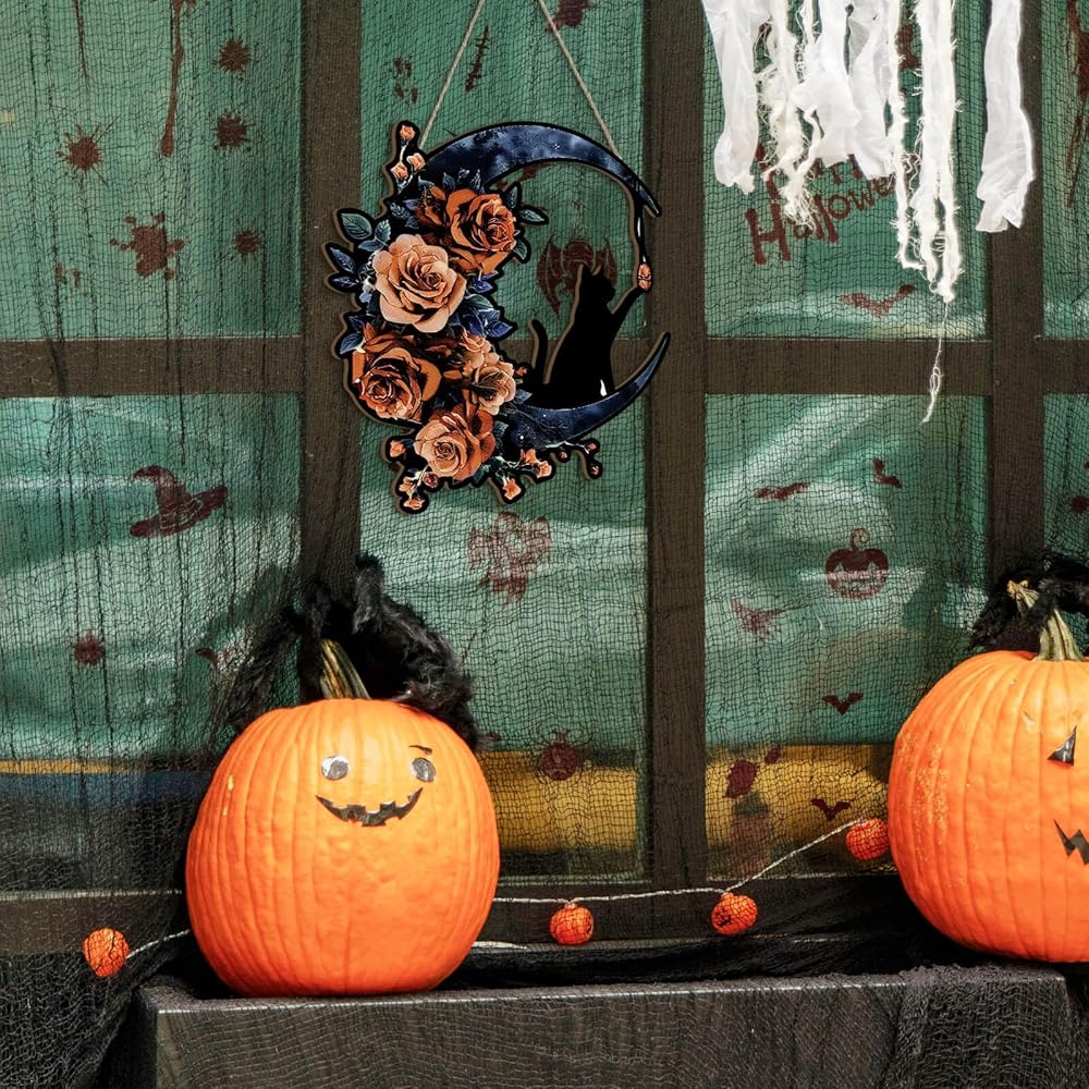 تصميم القط والقمر الأسود القوطي: يتميز إكليل الهالوين الفريد هذا بقطة سوداء تجلس على هلال محاط بالورود الأنيقة، مما يجعله مثاليًا لإضافة لمسة من السحر القوطي إلى ديكور باب الهالوين الأمامي الخاص بك.