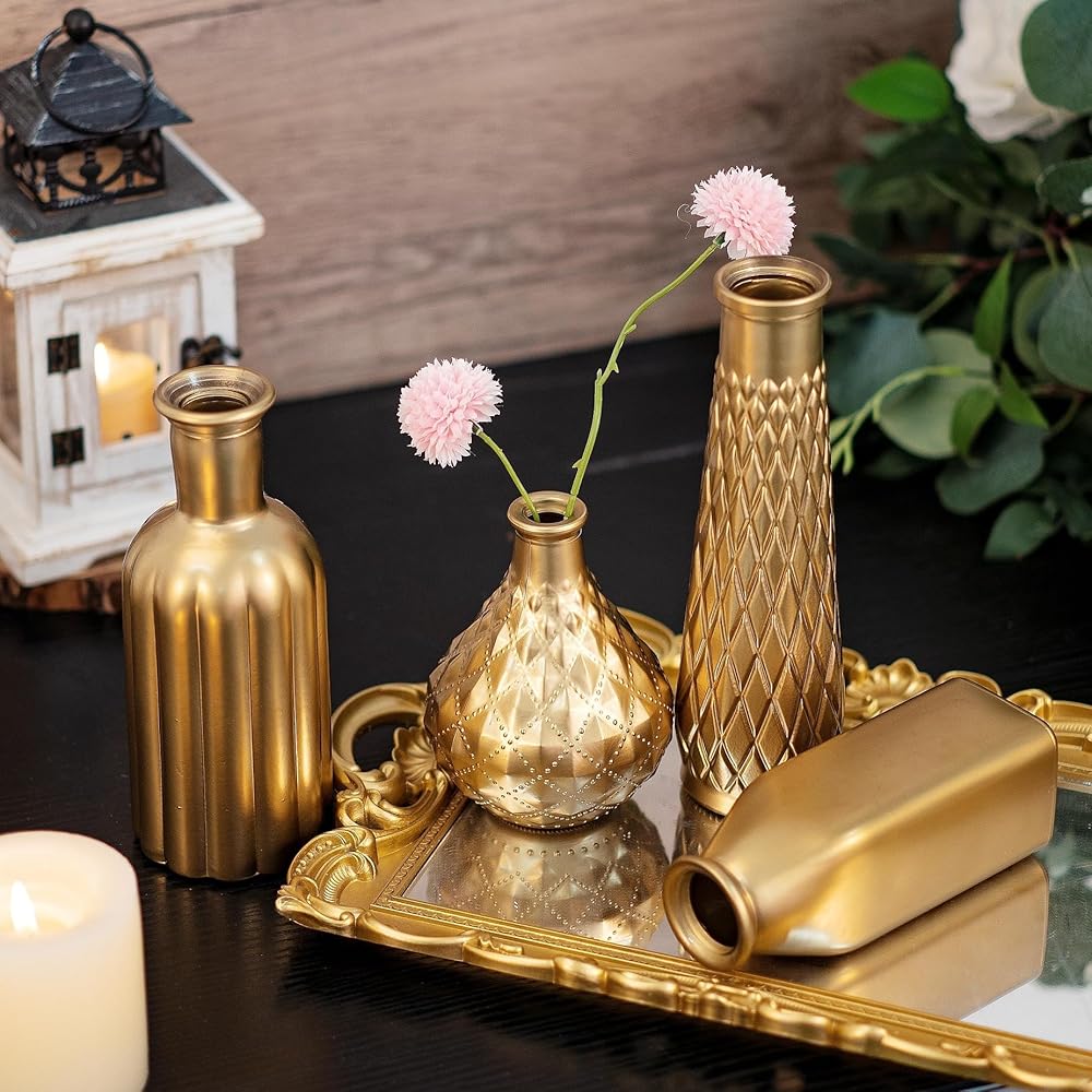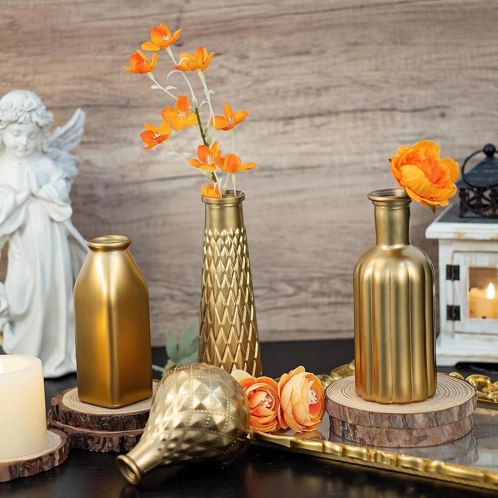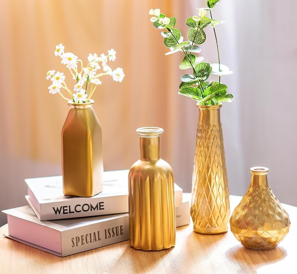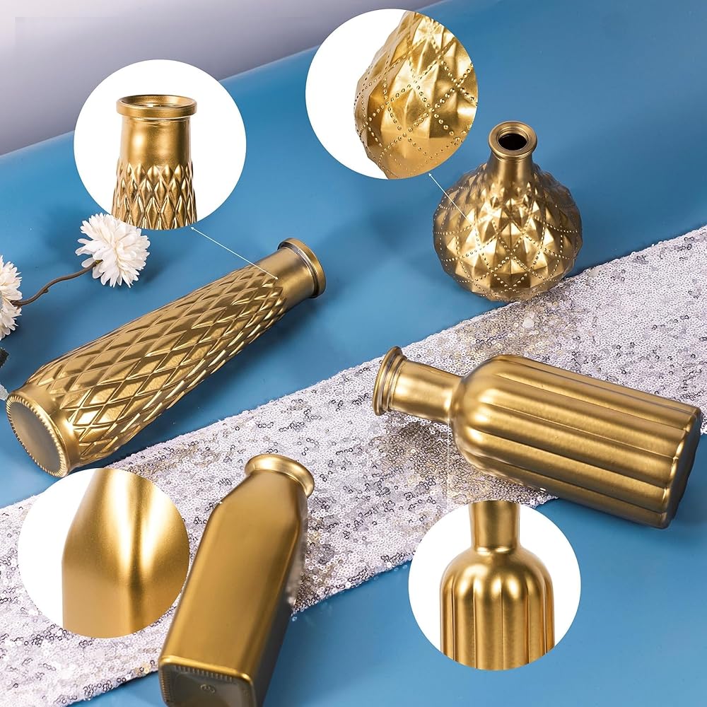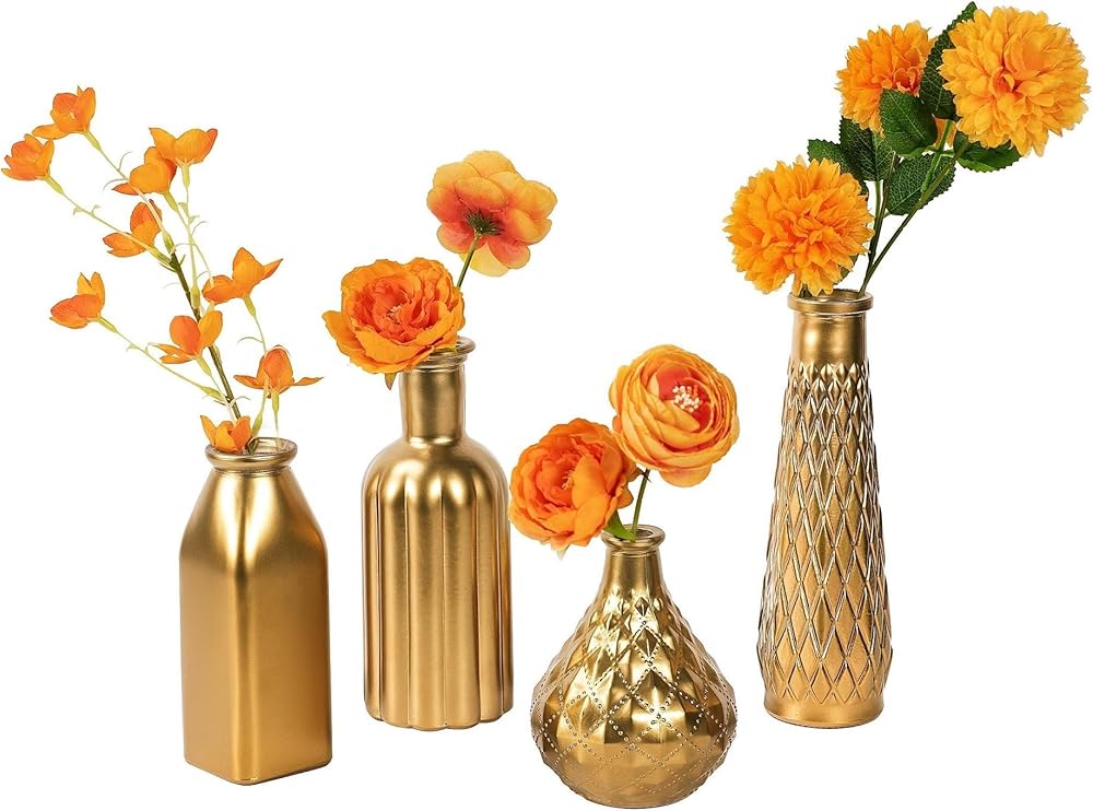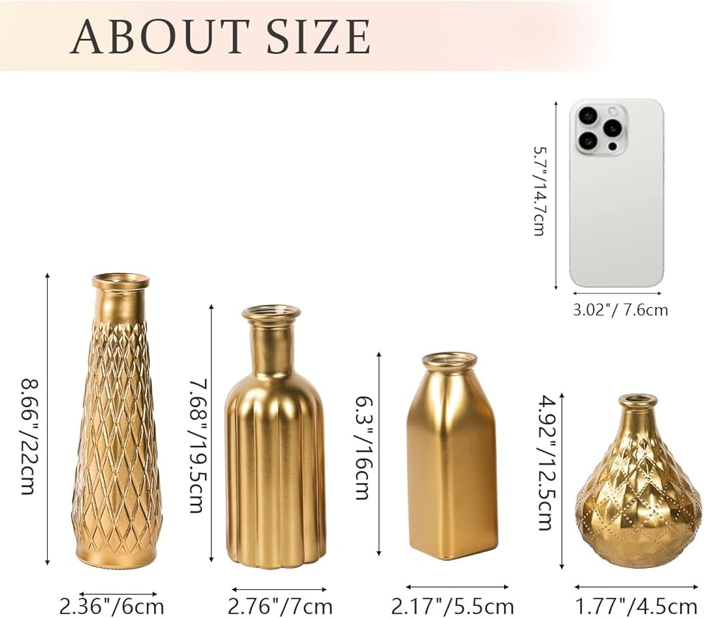 ☛تتضمن العبوة: مجموعة مزهرية صغيرة مكونة من 4 قطع. هذه المزهريات الأربعة ذات تصميمات وأحجام وأشكال مختلفة. يبلغ ارتفاعها 4.9 بوصة و6.3 بوصة و7.7 بوصة و8.7 بوصة من القصير إلى الطويل. يمكنك اختيار ومطابقة المزهريات الذهبية الصغيرة في مجموعات مختلفة وفقًا للمشهد والأسلوب والحالة المزاجية حتى بدون أي زهرة. هذه المزهريات البرعمية للزهور عملية ورائعة للغاية.