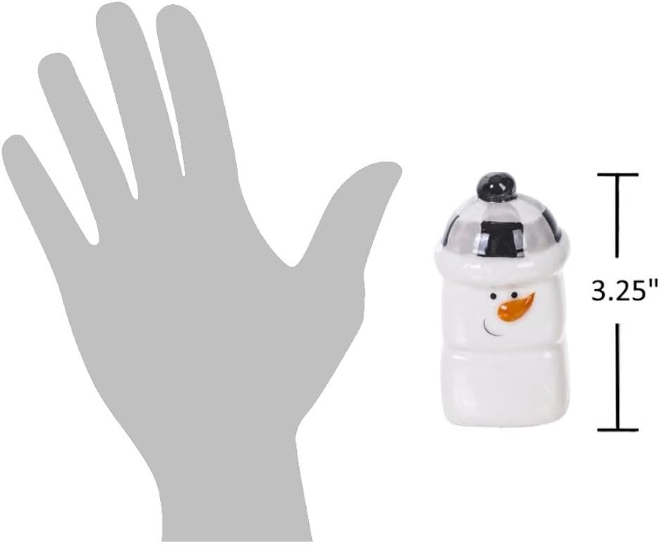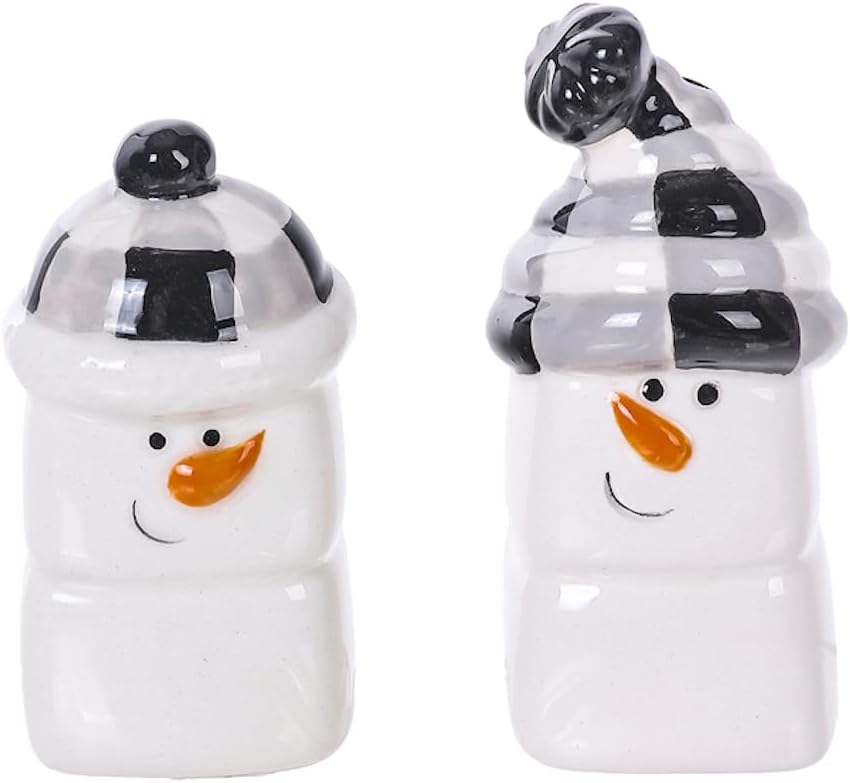 HIGH QUALITY MATERIALS: The holiday salt & pepper set is crafted from ceramic for a sturdy and long lasting accent piece. Designed in the shape of marshmallow-like snowmen wearing winter hats, the classic kitchen decor keeps your space looking stylish and trendy year after year.
