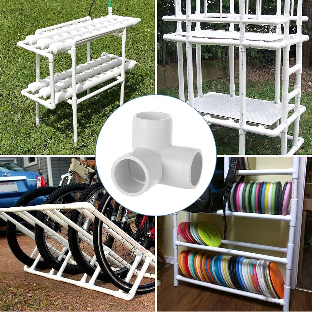 Feature: 1/2 Inch 3 way pvc fittings elbow for edge, corner and center connections, professional design with tapered sockets; 1/2 inch PVC fitting 3 way adopts glossy white surface, glitch-free, nice for display items or DIY furniture