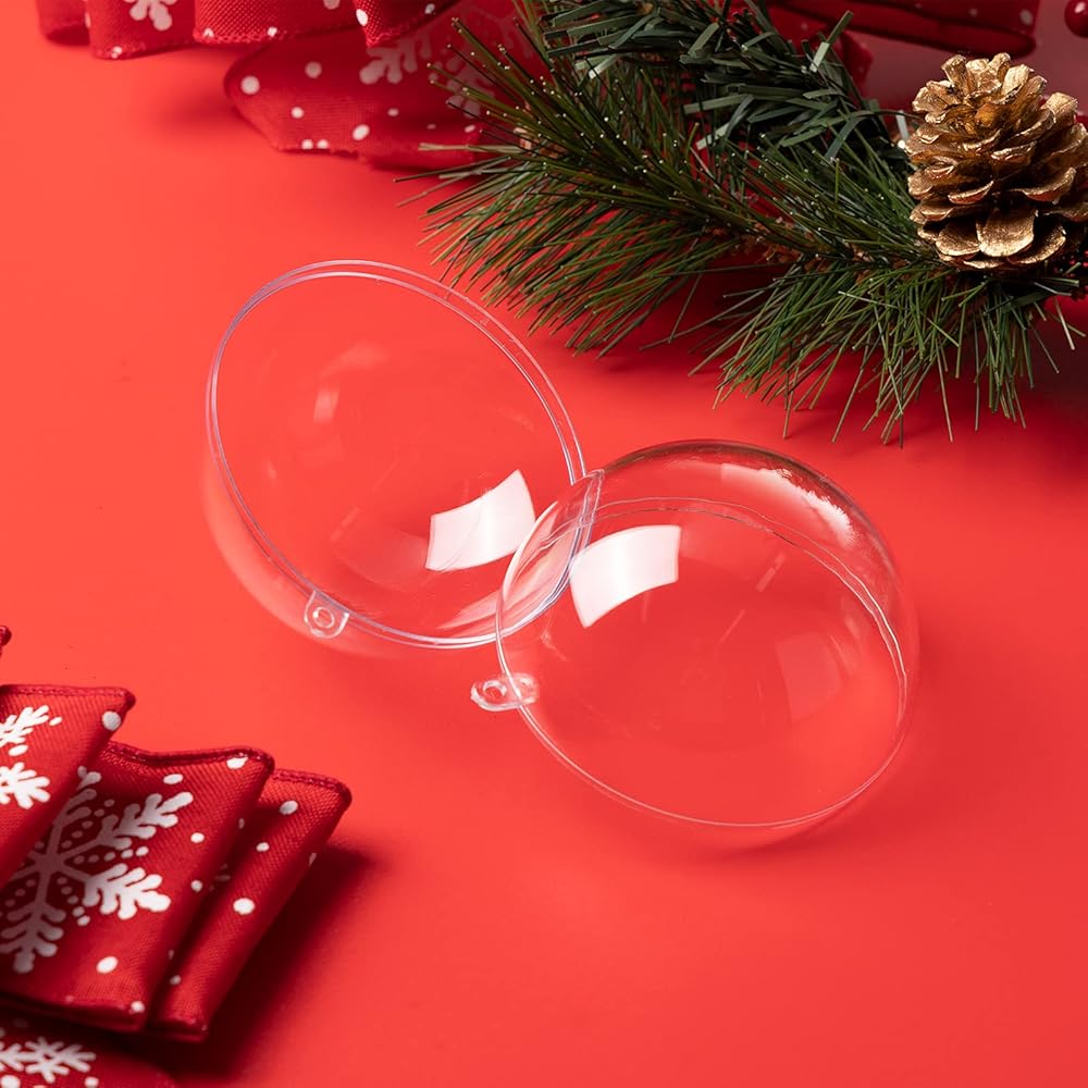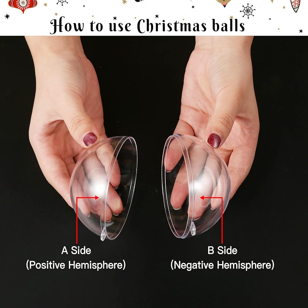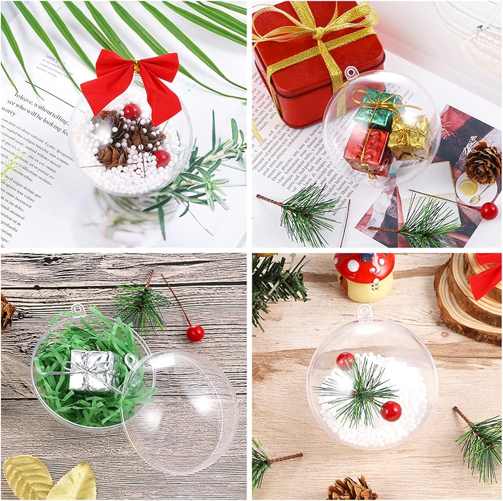 جودة عالية: هذه الحلي الشفافة مصنوعة من بلاستيك قوي ومتين، وخفيفة الوزن، وشفافة مثل مادة الزجاج ولكن لا يمكن كسرها بسهولة. الملحقات مصنوعة من مواد آمنة ومتينة، ويمكن وضعها بشكل متكرر. يمكنك تبديل الحشو من الكرات كما تريدين وإعادة استخدامها في المزيد من مناسبات التزيين