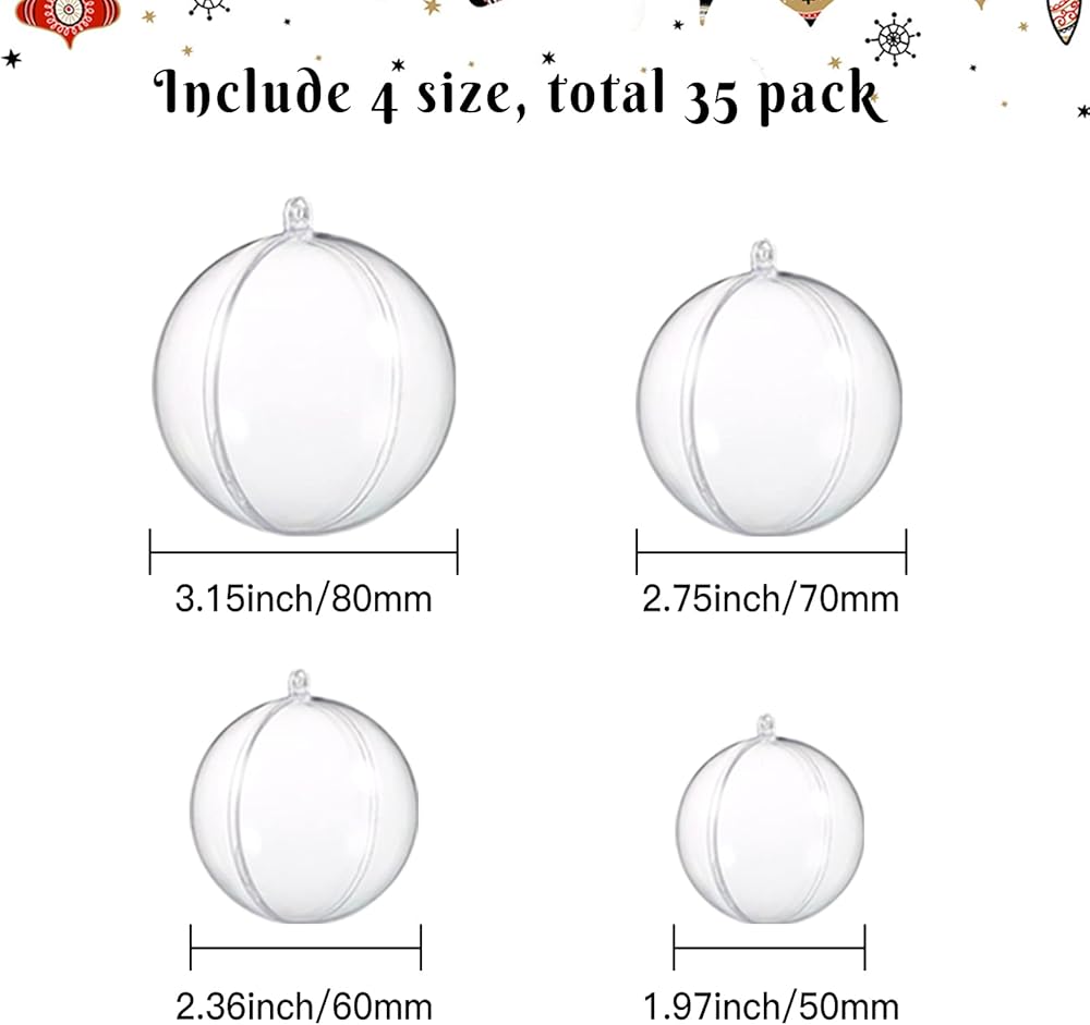 حزمة قيمة: تتضمن إجمالي 35 قطعة من الكرات البلاستيكية الشفافة القابلة للتعبئة (في 4 أحجام)، بالإضافة إلى 14 شكلًا من الملحقات! تحتوي الكرات على 4 أحجام مختلفة، تغطي كرة بقطر 5 × 8 سم؛ 10 × كرة بقطر 7 سم؛ 10 × كرة بقطر 6 سم؛ 10 × كرة بقطر 5 سم. مجموعة حرفية كاملة تساعدك على صنع العديد من الحلي المعلقة أو العناصر الحرفية الجميلة