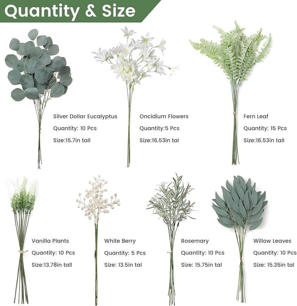 【الكمية والحجم】عبوة مكونة من 65 قطعة مع 7 أنواع من صناديق السيقان الخضراء الاصطناعية تتضمن: 10 × أوكالبتوس دولار فضي (15.7 بوصة)، 15x ورقة سرخس (16.53 بوصة)، 5x زهور أونسيديوم (16.53 بوصة)، 10x أوراق الصفصاف (15.35 بوصة) )، 5x توت أبيض (13.5 بوصة)، 10x روزماري (15.75 بوصة)، 10x لافندر (13.78 بوصة).