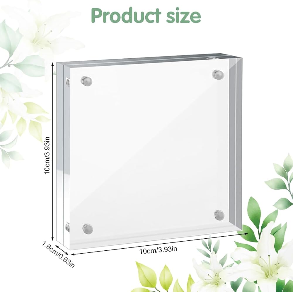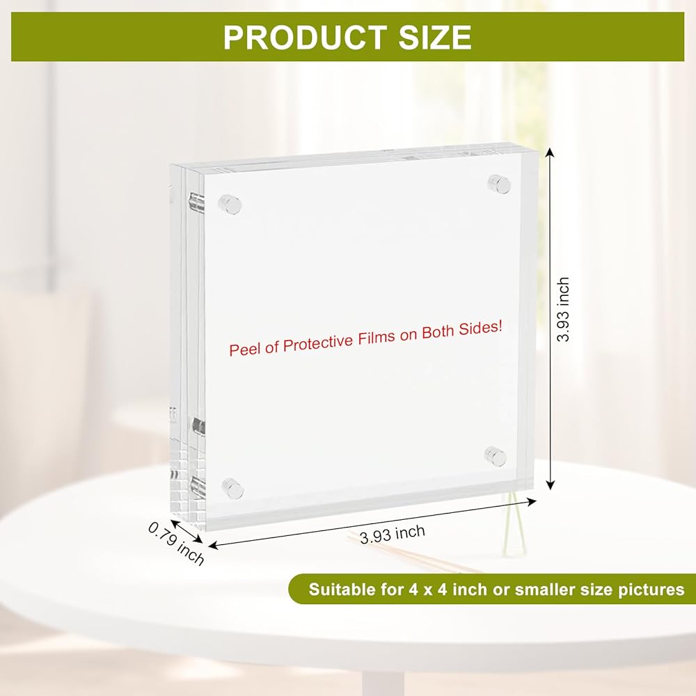 [Product size] The size of this acrylic photo frame is 4''×4''. Each set of products contains 16 acrylic magnetic photo frames. You can print pictures smaller or equal to 4''×4'' and place them on these acrylic photo frames to display your beautiful moments.Please remove the protective film on both sides of each acrylic sheet before using the photo frame.