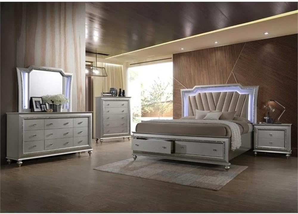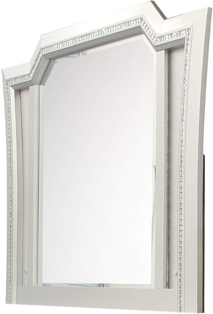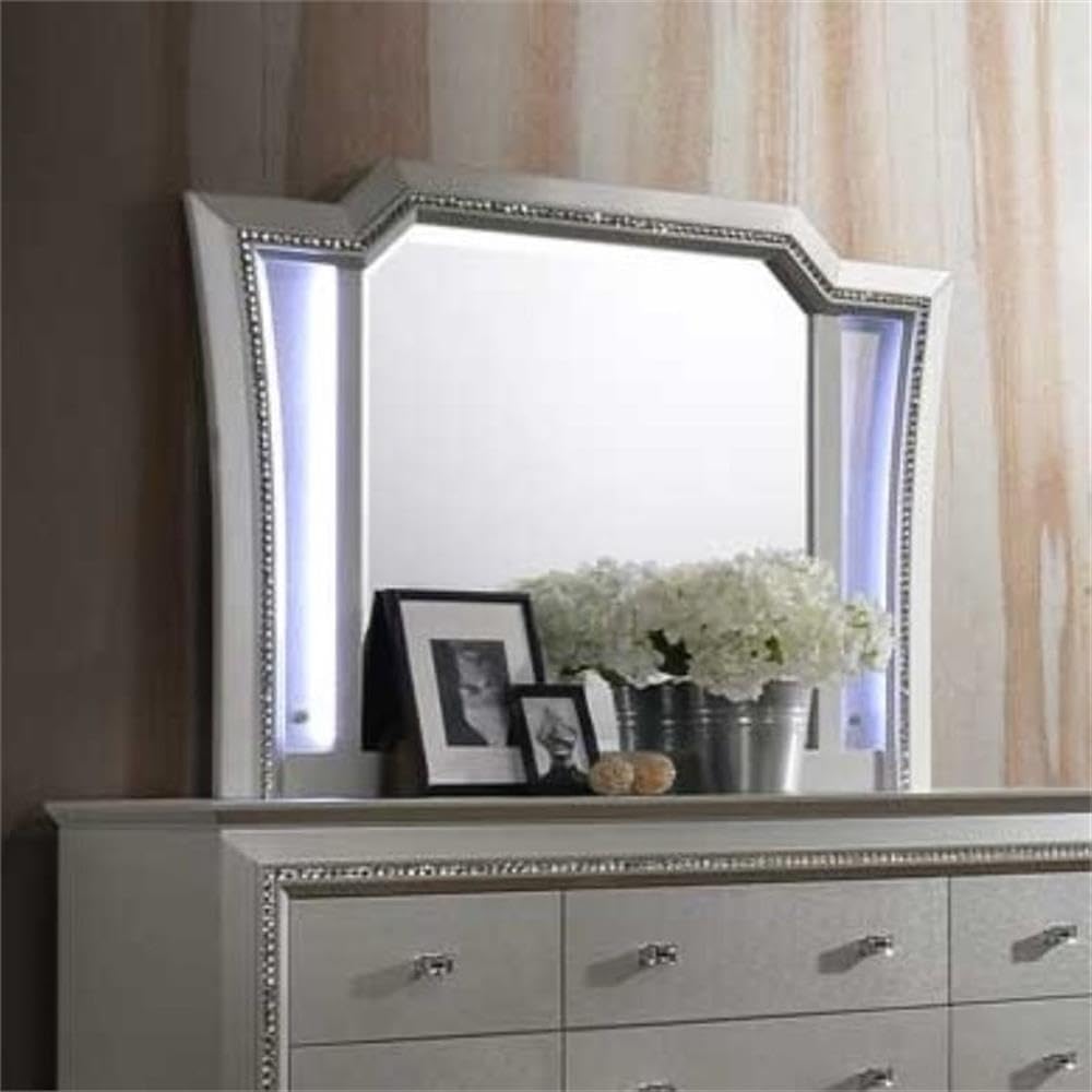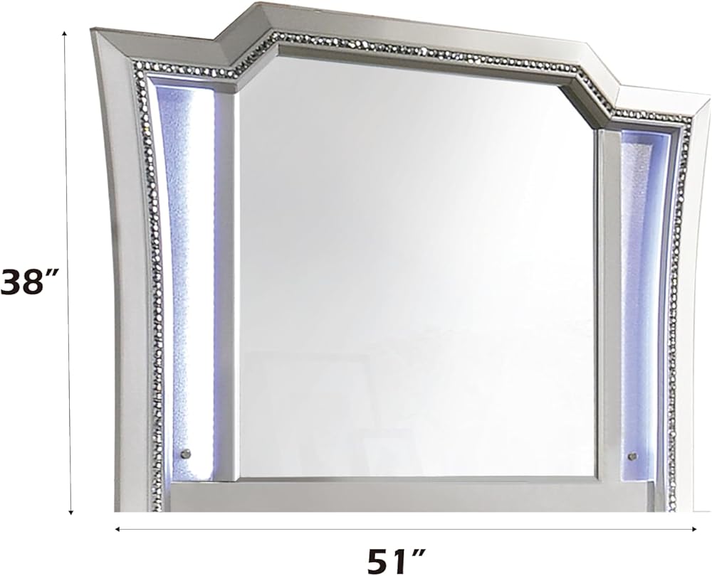 The Kaitlyn mirror provides a commanding presence in any room. Crafted with a transitional look that is an ideal addition to any bedroom, the mirror is accented with LED light and a crystal-like sparkling trim. Its crystal-like trimming creates dazzling glow for your master bedroom.