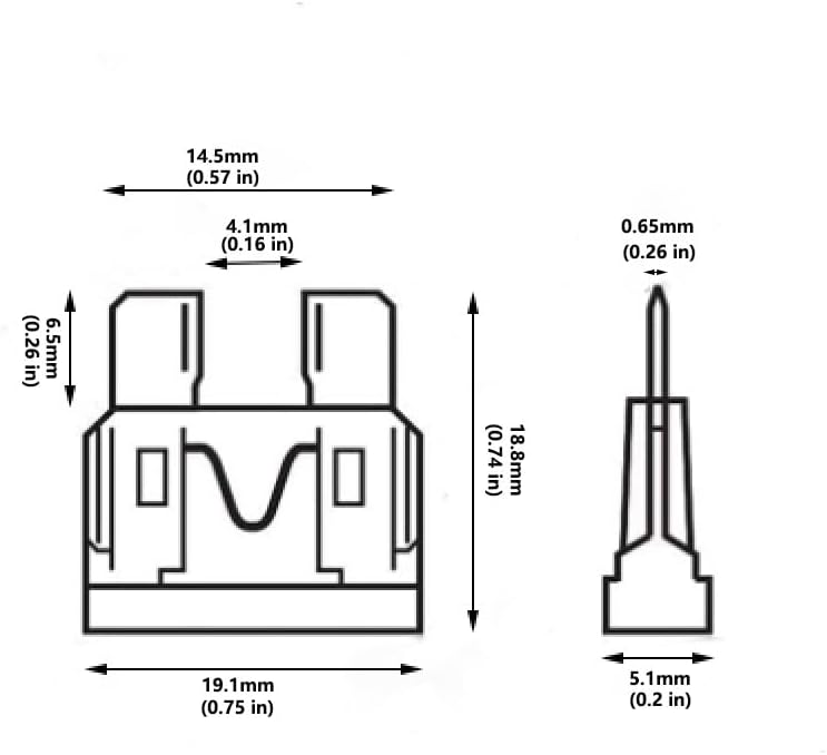 Standard blade fuse: 0. 75 x0. 74 x0. 3 inches.