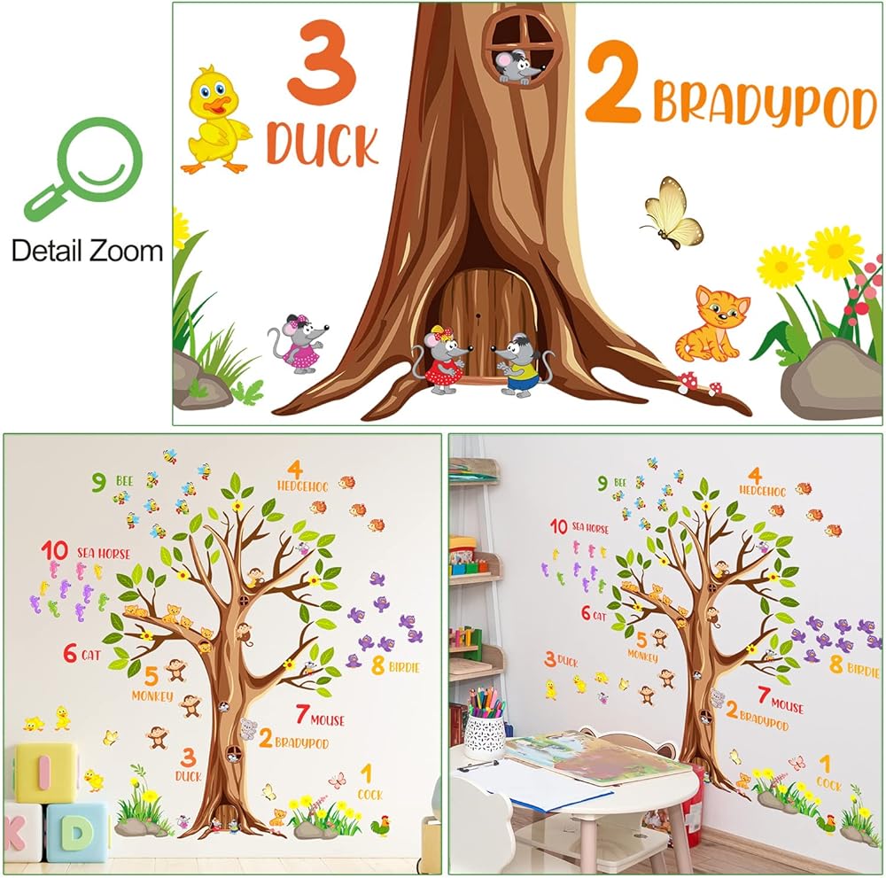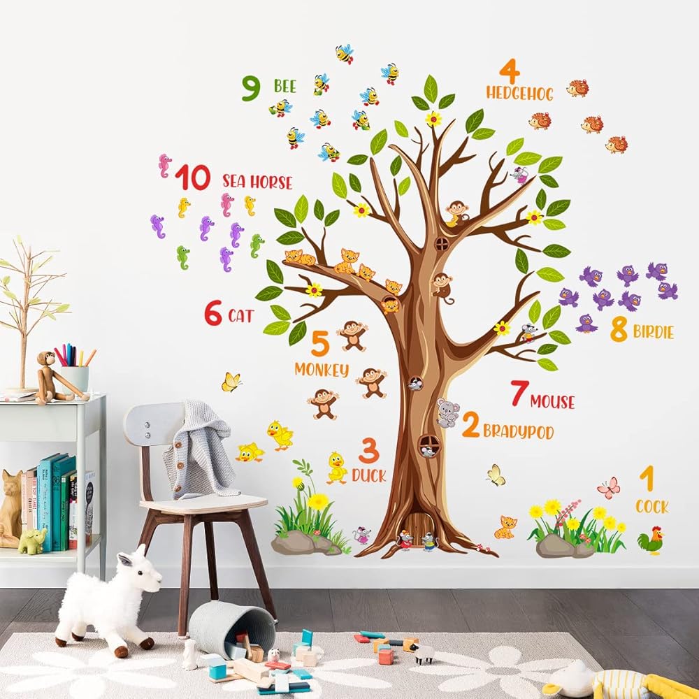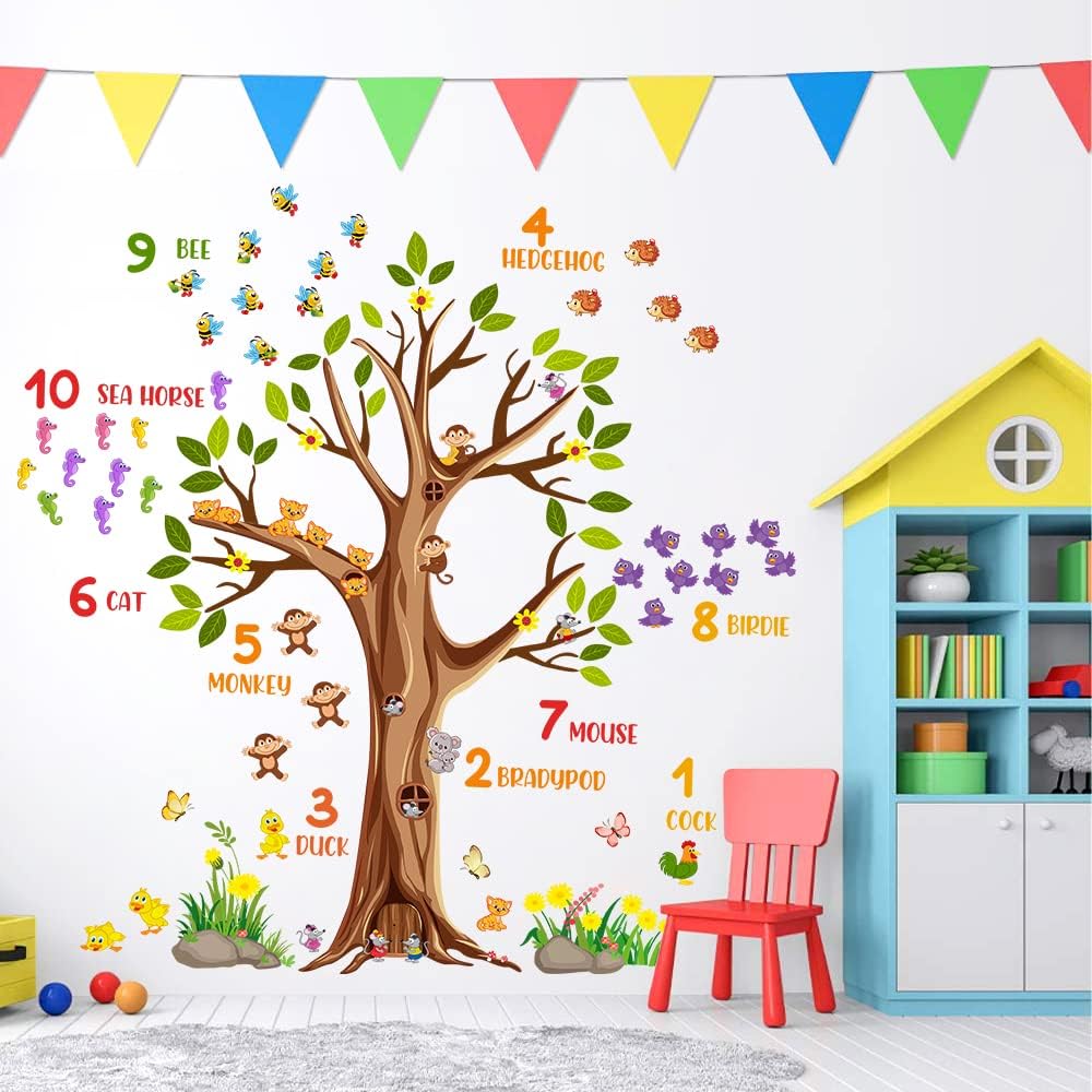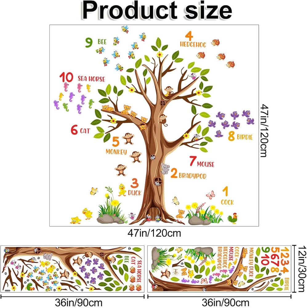 Large brown tree wall sticker digital mumber jungle forest animals green tree branches wall decals are positive and educational for kids, come and show!Specification:Material: VinylColor: ColorfulPackage: Including 2 piece of sheetsEach Sheet Size: 12inch x 36inch/30cm x 90cmFeatures:1.Easy to apply, removable, durable, pressure resistance, shock resistance, waterproof.2.It can be applied to any smooth , clean and dry surface of walls, tiles, glass, furniture, etc. NOT suitable for dirty or rough surface.3.Removable, Repositionable without leaving marks & sticky residue.How To Use:-Choose a smooth, clean and dry surface. Peel the stickers from the sheet one by one.-Peel off the sticker from the sheet and carefully paste it on the surface of your choice to be decorated. You can follow the steps in the picture, or you can stitch pictures according to your preferences.-If for any reason you choose to remove your decals, they can be lifted and peeled away easily, without leaving any residue or sticky mess and without the need for redecorating!Please Note:1.Ensure the surface is smooth, do not stick on the rough or uneven surface.2.Choose the place you want to apply, clean up the ash and grease, keep it dry and clean.3.Due to manual measurement, a measurement error of 1-3cm is allowed within the normal range.4.Due to factors such as lighting effects and the brightness/contrast settings of the monitor, the color tone of the website photos and actual items may be slightly different. Thanks for your understanding!About After-sale:In RAINBOW WSK store, we are committed to provide perfect products and services in the wall decoration stickers categories, if you have any problem, we will do our best to solve the problem for you.