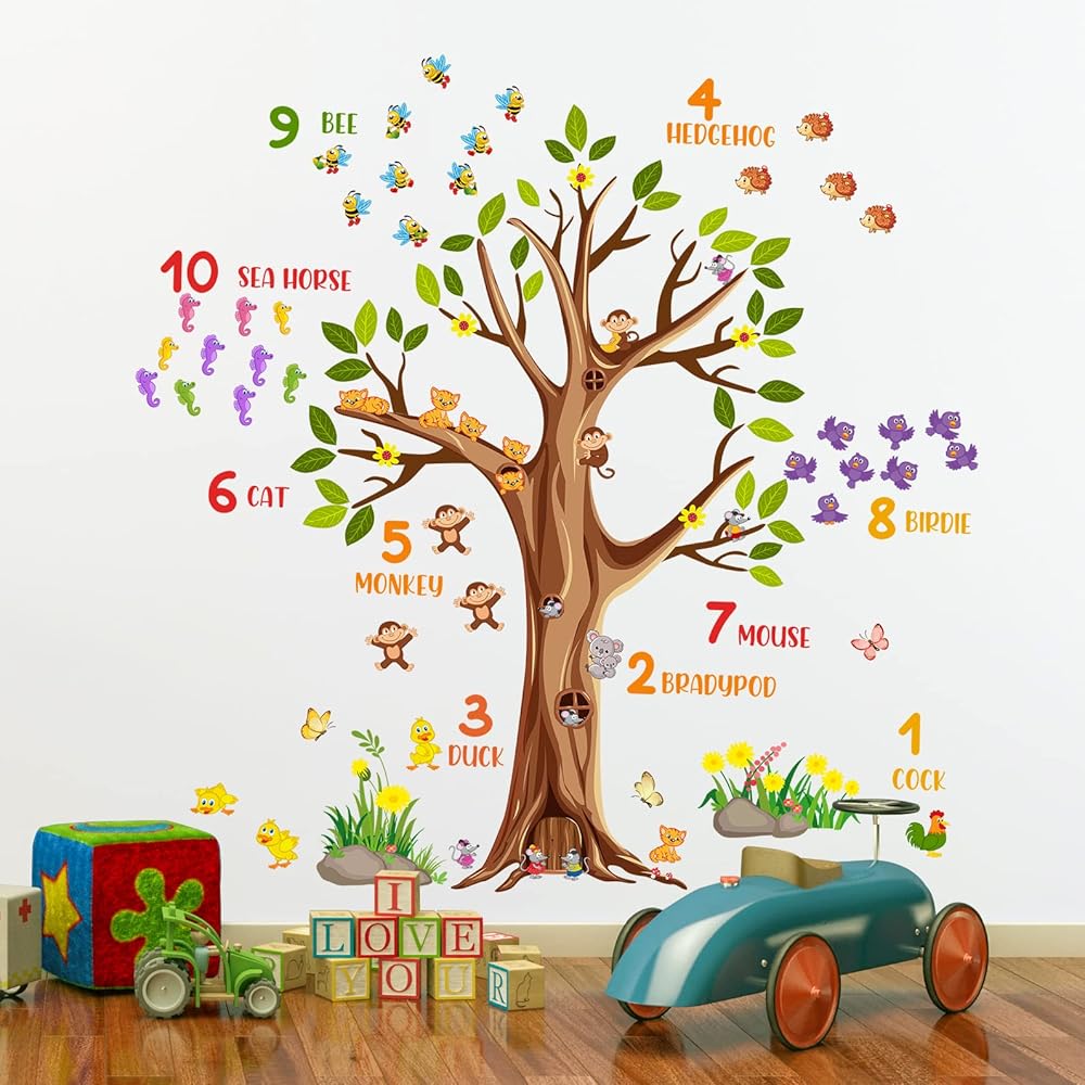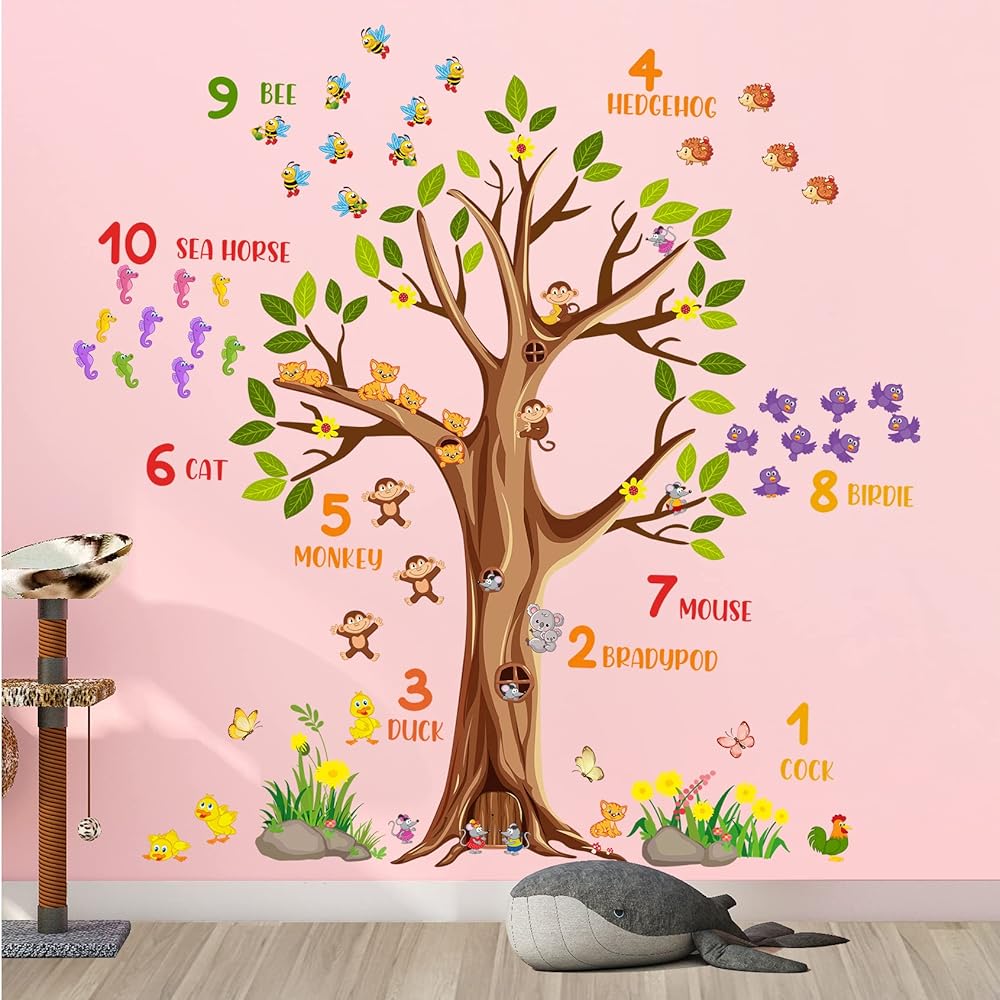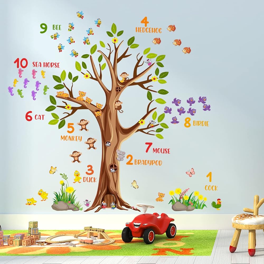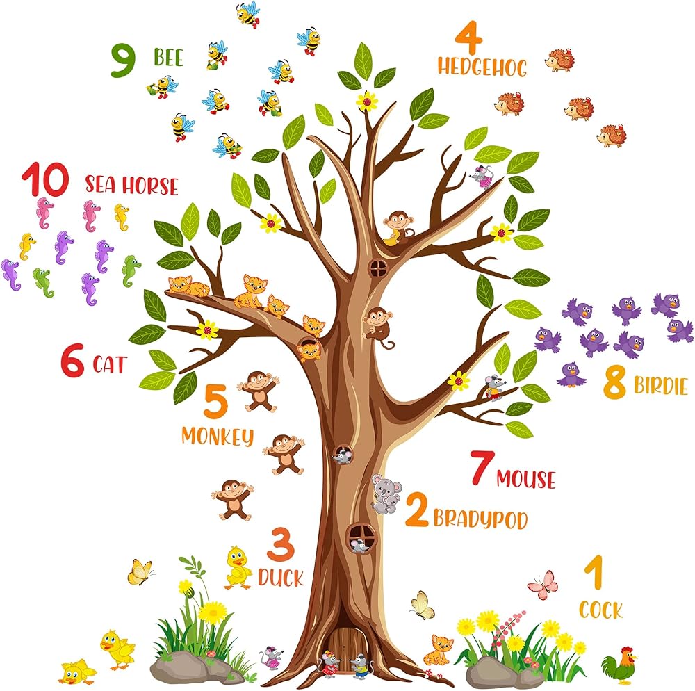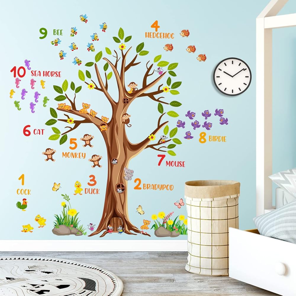 Large brown tree wall sticker digital mumber jungle forest animals green tree branches wall decals are positive and educational for kids, come and show!Specification:Material: VinylColor: ColorfulPackage: Including 2 piece of sheetsEach Sheet Size: 12inch x 36inch/30cm x 90cmFeatures:1.Easy to apply, removable, durable, pressure resistance, shock resistance, waterproof.2.It can be applied to any smooth , clean and dry surface of walls, tiles, glass, furniture, etc. NOT suitable for dirty or rough surface.3.Removable, Repositionable without leaving marks & sticky residue.How To Use:-Choose a smooth, clean and dry surface. Peel the stickers from the sheet one by one.-Peel off the sticker from the sheet and carefully paste it on the surface of your choice to be decorated. You can follow the steps in the picture, or you can stitch pictures according to your preferences.-If for any reason you choose to remove your decals, they can be lifted and peeled away easily, without leaving any residue or sticky mess and without the need for redecorating!Please Note:1.Ensure the surface is smooth, do not stick on the rough or uneven surface.2.Choose the place you want to apply, clean up the ash and grease, keep it dry and clean.3.Due to manual measurement, a measurement error of 1-3cm is allowed within the normal range.4.Due to factors such as lighting effects and the brightness/contrast settings of the monitor, the color tone of the website photos and actual items may be slightly different. Thanks for your understanding!About After-sale:In RAINBOW WSK store, we are committed to provide perfect products and services in the wall decoration stickers categories, if you have any problem, we will do our best to solve the problem for you.