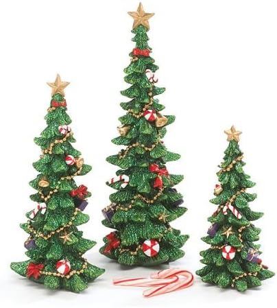 Assortment of 3 Christmas tree hand painted resin figurines. Small: 6"H X 3"Diameter Medium: 7 3/4"H X 3 1/2"Diameter Large: 9 3/4"H X 3 3/4"Diameter.