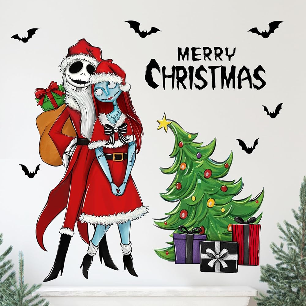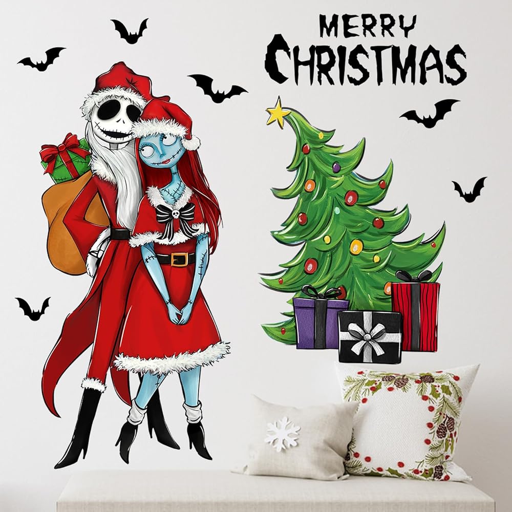 Mfault Merry Christmas Night.tmare BEF.ore عيد الميلاد ملصقات الحائط الشارات، جاك Skellington سالي شجرة عيد الميلاد الجمجمة الخفافيش الديكور غرفة نوم الفن، 2025 السنة الجديدة غرفة المعيشة المنزل المطبخ ديكور هدايا العيد