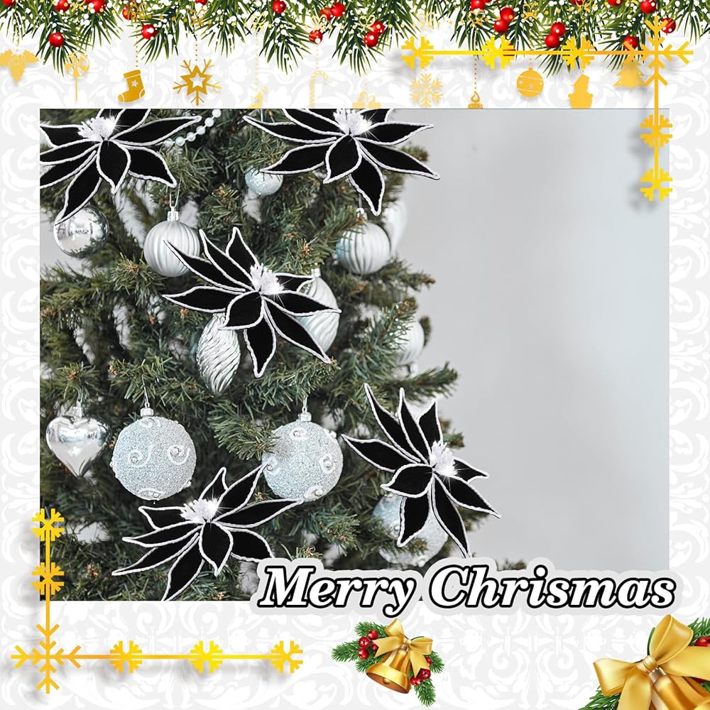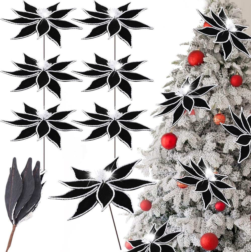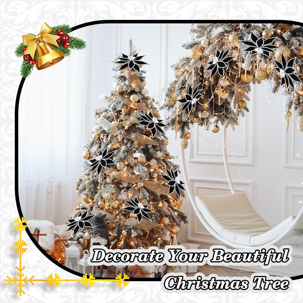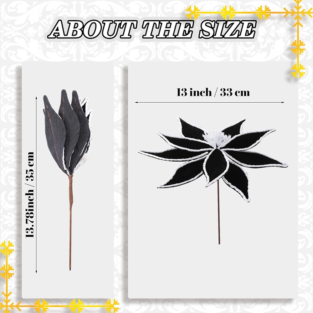 Ideal Sizing for Versatile Decor: the black Christmas poinsettia decorations measure about 13 inch in diameter and 13.78 inches in total length, making them prominent enough to get noticed and fit within any decoration scheme; After receiving the black Christmas flowers, unfold the flowers and shake off the pollen that has fallen slightly from the stamens; Suitable for mantle, Christmas wreaths, rattan, room decor, Christmas tree decoration, craft projects, holiday flower arrangements or vases