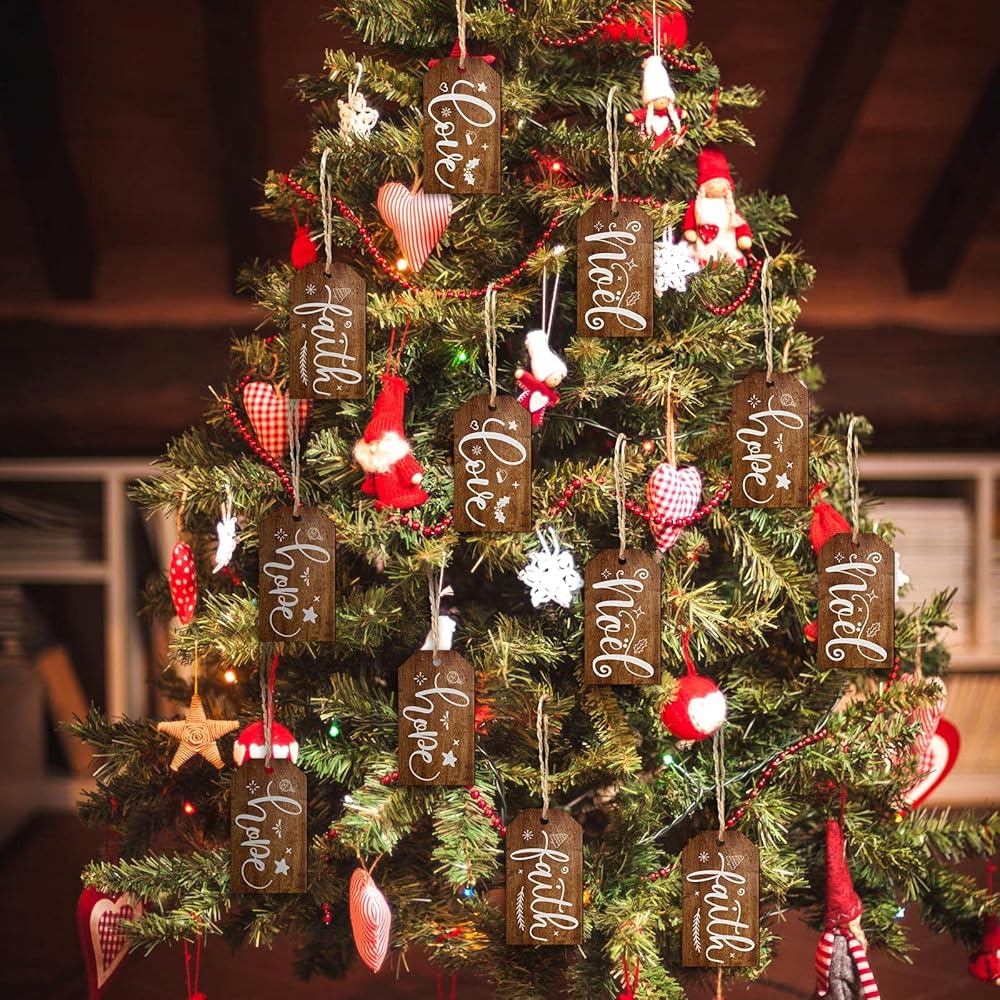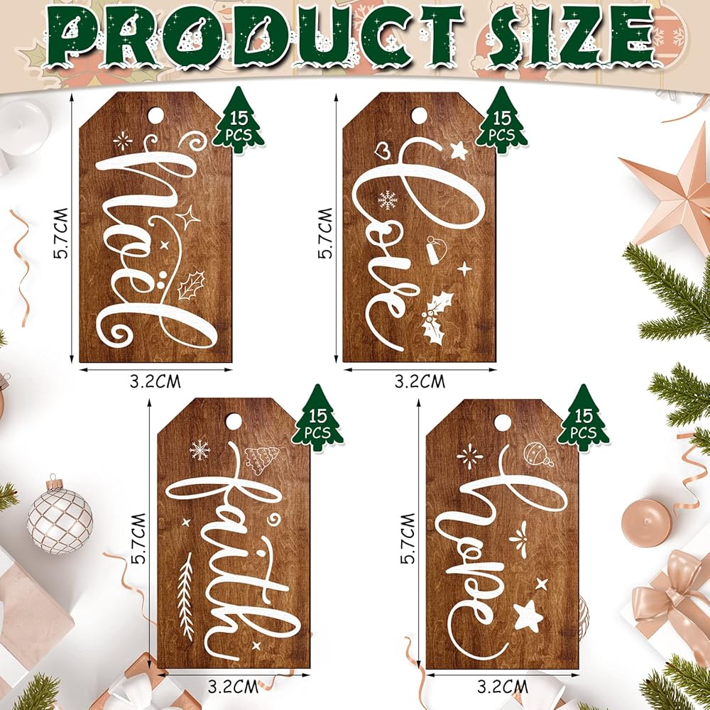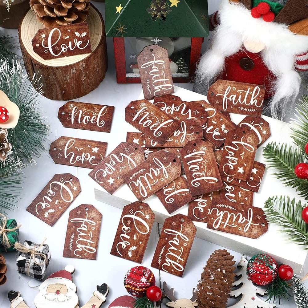 60 قطعة عيد الميلاد علامة خشبية تسمية شجرة عيد الميلاد زخرفة عيد الميلاد ريفي خشبي علامة نويل الإيمان الأمل الحب علامة مزرعة خمر علامة معلقة مع حبل لتزيين شجرة عيد الميلاد تخزين (بني)