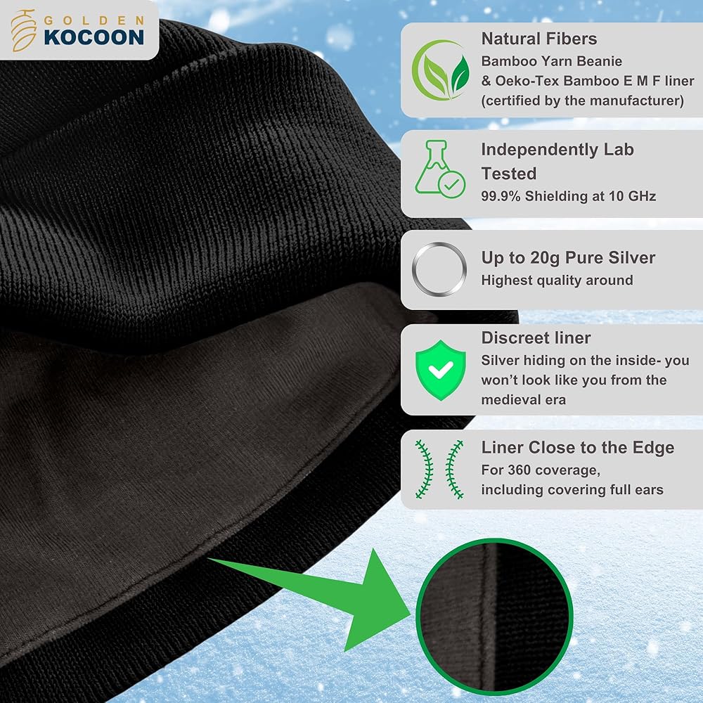 👂بطانة سرية بتغطية كاملة: تصميم البطانة الفريد الخاص بنا يضمن حماية 360 درجة، ويمتد إلى مستوى منخفض لتغطية أذنيك. مع نسيج الخيزران على بشرتك والفضة المخفية، ستحصل على أفضل ما في العالمين - الحماية والمظهر الأنيق. لا يبدو أنك من عصر القرون الوسطى!