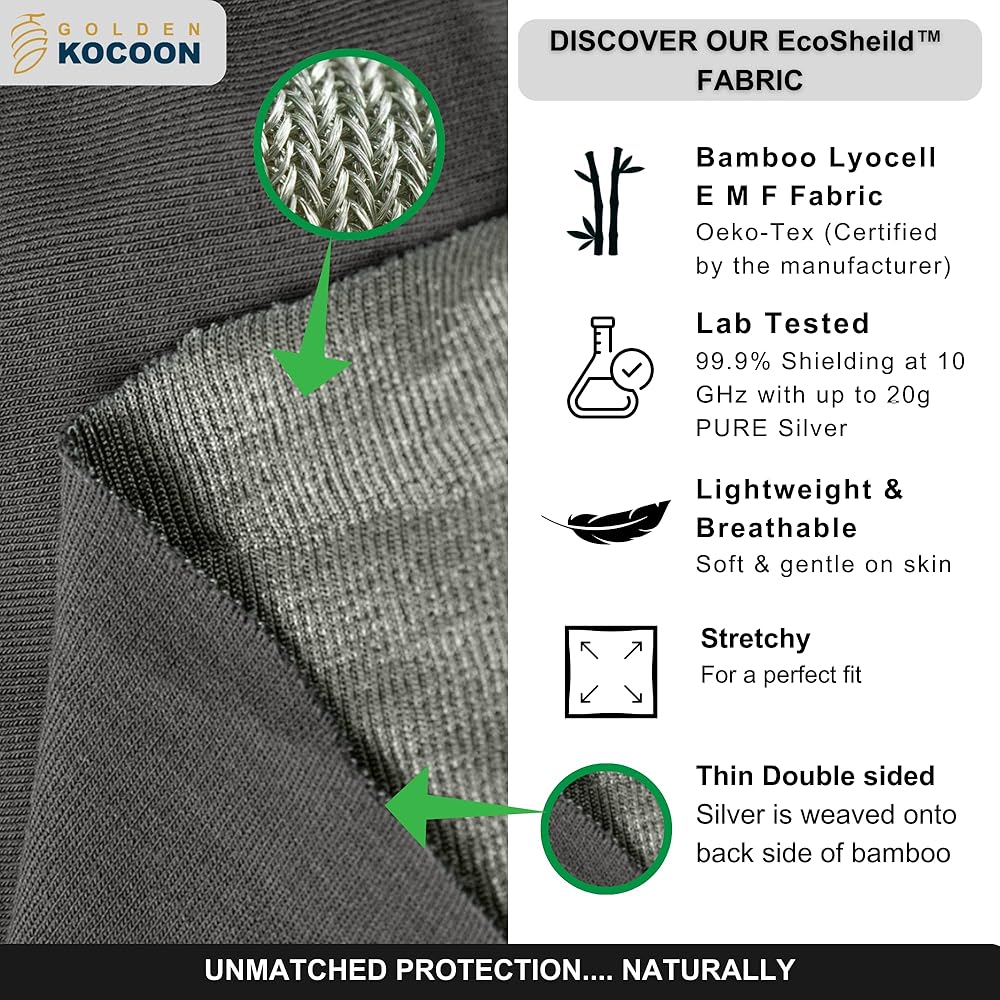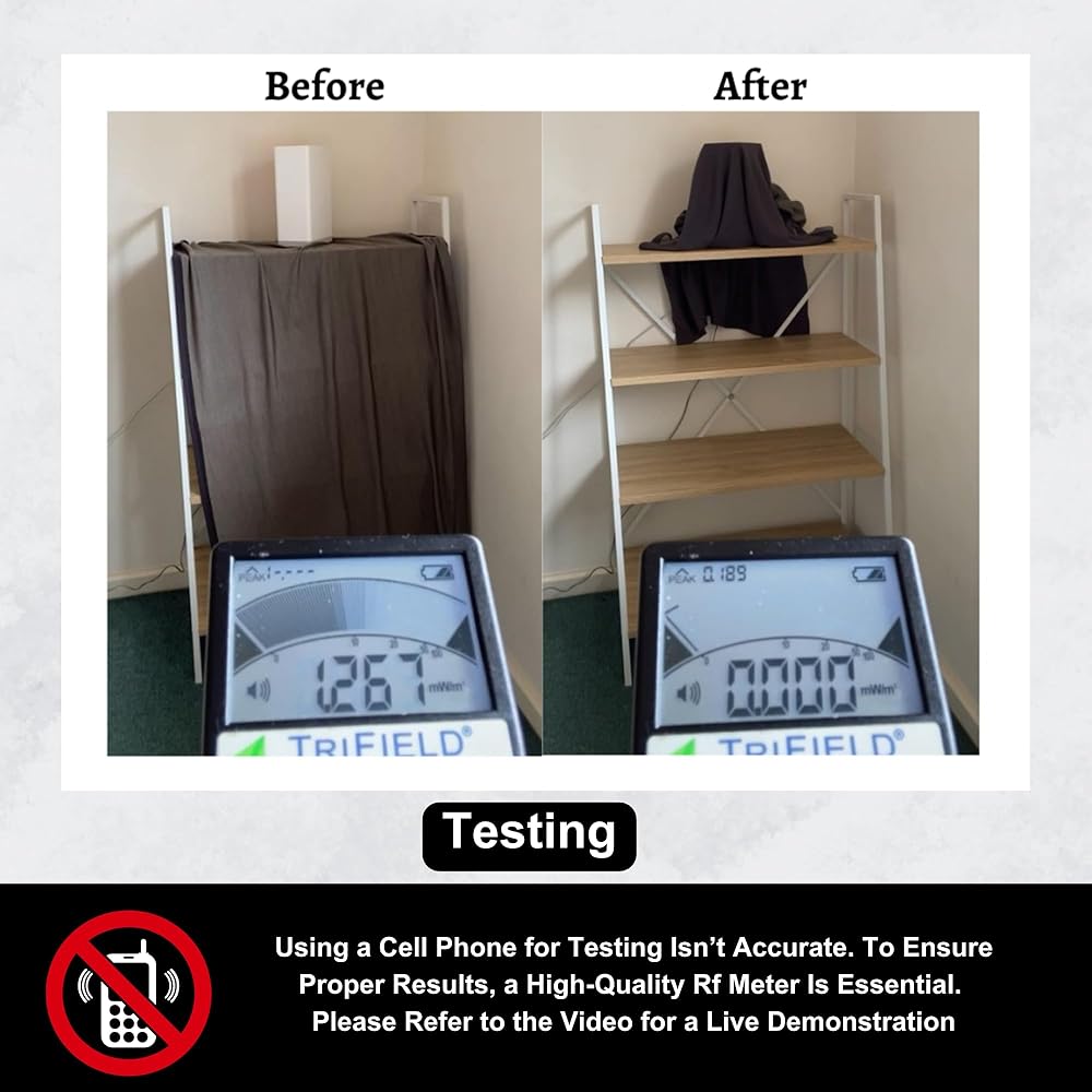 🧪تم اختباره في المعمل من قبل طرف ثالث: يحتوي هذا القماش على ما يصل إلى 20 جرامًا من الفضة النقية التي تعكس 99.9% من إشعاع التردد الراديوي (10 ميجا هرتز إلى 10 جيجا هرتز)، مما يوفر توهين 35-40 ديسيبل ضد شبكة Wi-Fi، و5 G، والخلوي، و إشارات بلوتوث، كل ذلك مع الحفاظ على الراحة والأناقة.