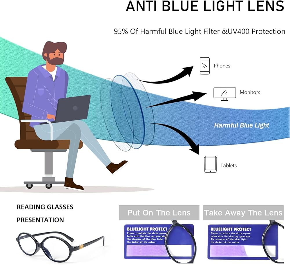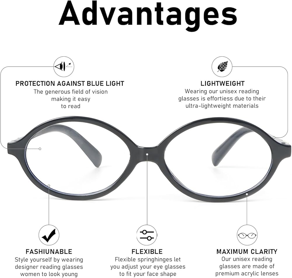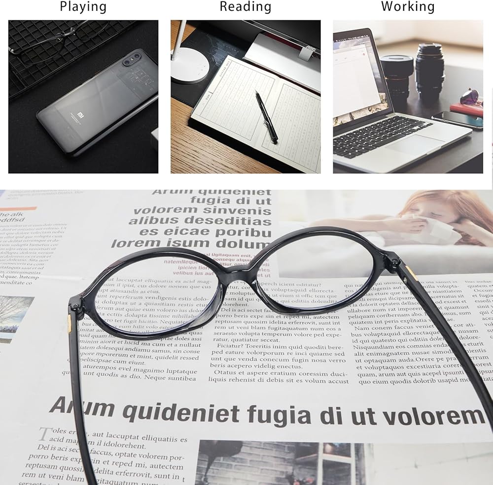 قراءة رؤية عالية الوضوح - تتميز النظارات بدقة أعلى، وسهلة قراءة الشخصيات الصغيرة، وتتمتع بشفافية جيدة، وتقلل من الانعكاسات والخدوش. تضمن نظارات قارئ البطاقات ذات الإطار الدائري الكبير الحصول على ألوان حقيقية، وعدم وجود ضبابية أو تشويه، ومجال رؤية أكبر.