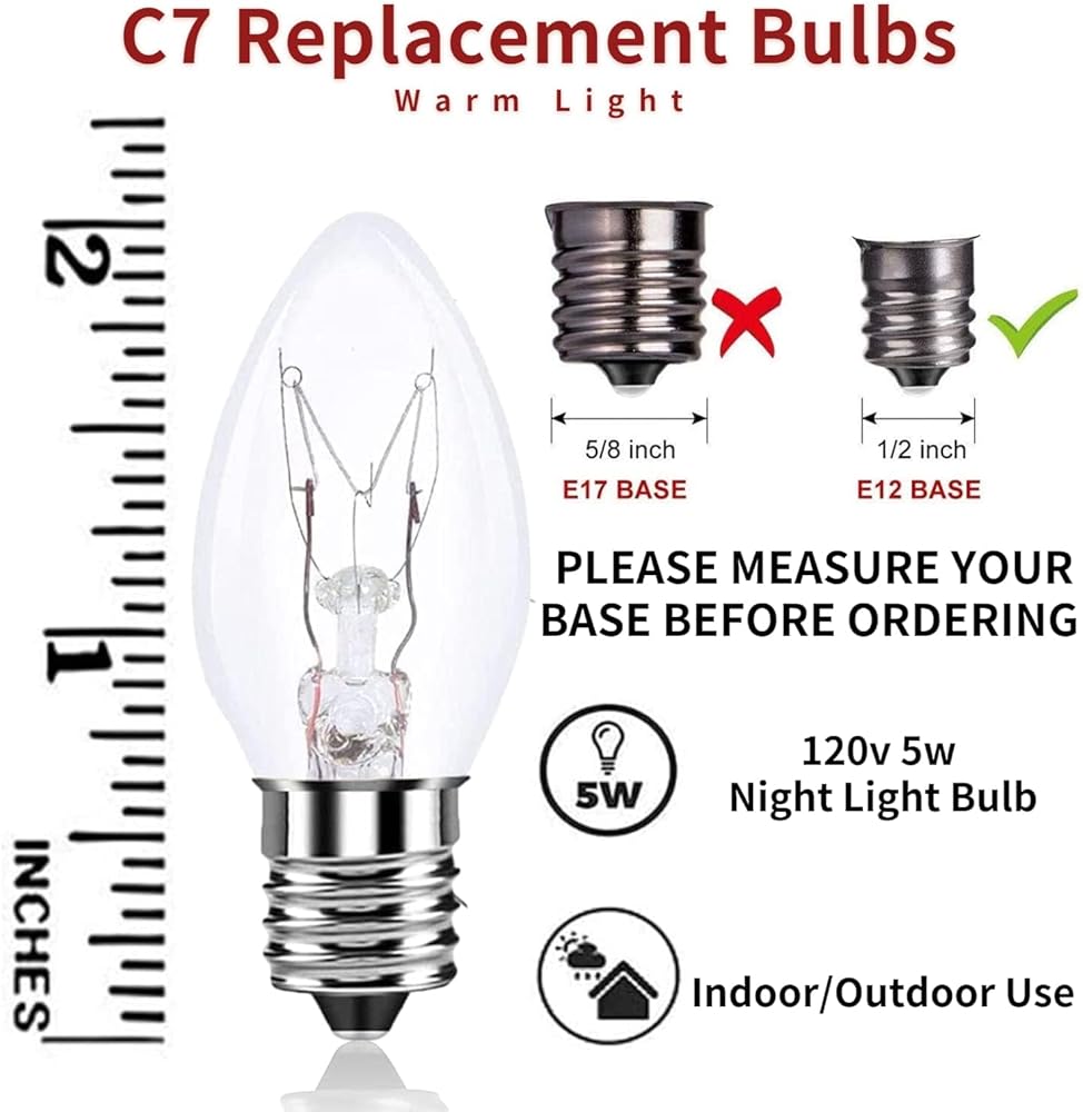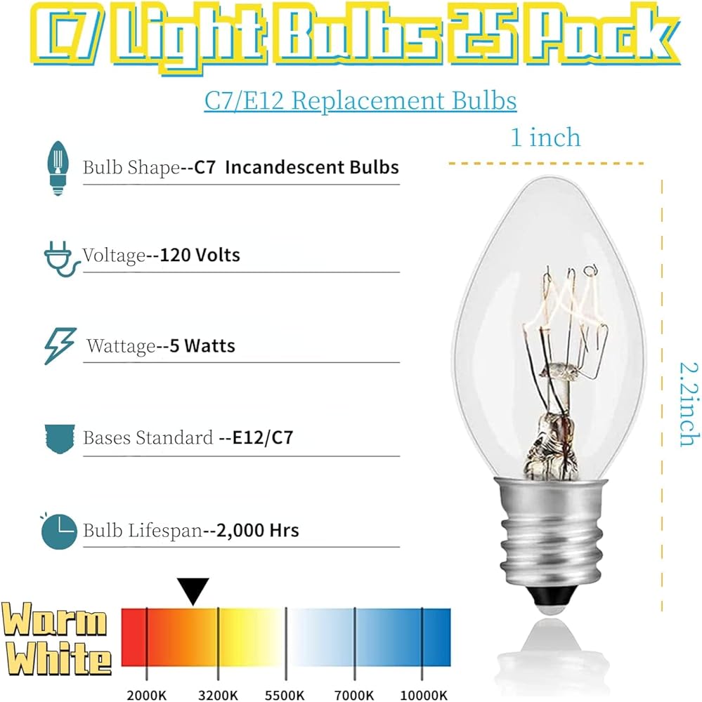 • مصابيح إضاءة C7 لعيد الميلاد: 25 عبوة C7 مصابيح متعددة الألوان 5 واط لكل لمبة و120 فولت، مصابيح بديلة زجاجية بقاعدة E12. توفر مصابيح C7 هذه توهجًا دافئًا ومريحًا، وهي مثالية لخلق جو عيد الميلاد السحري في منزلك، أو على شجرتك، أو على طول حديقتك والفناء.
