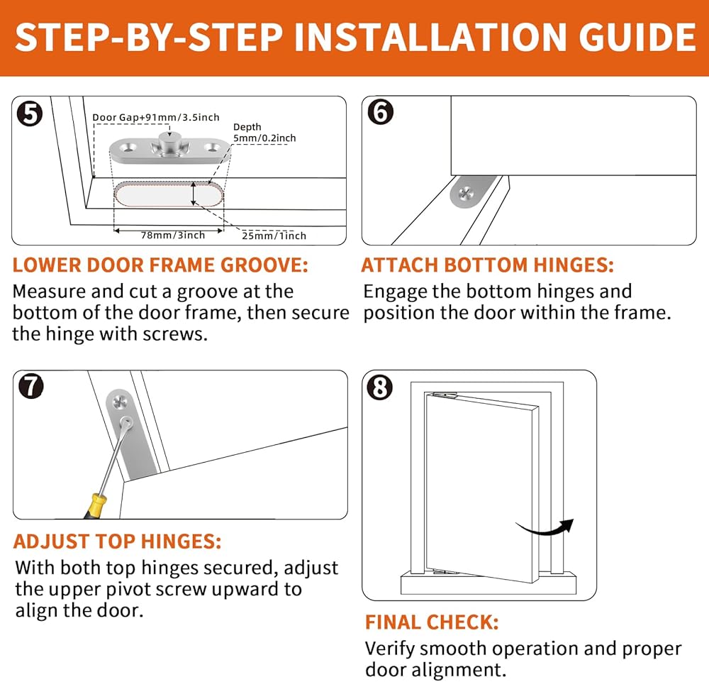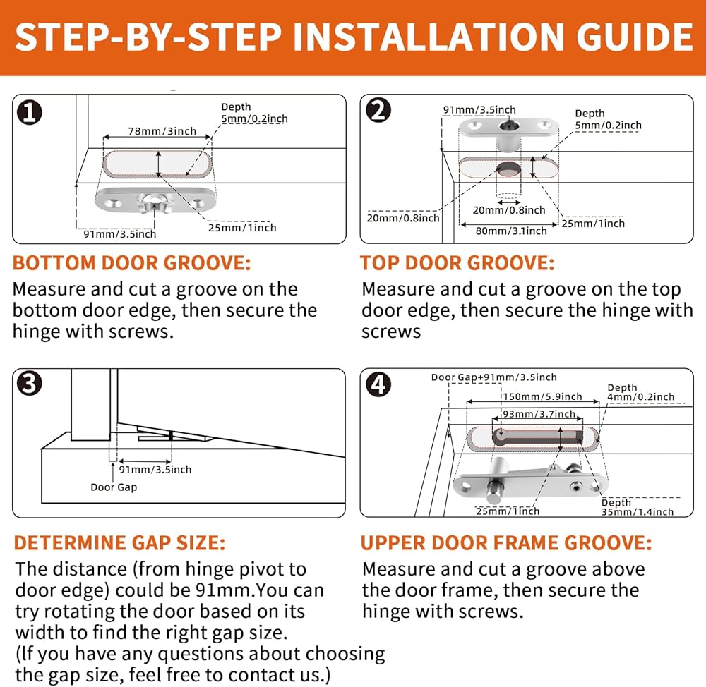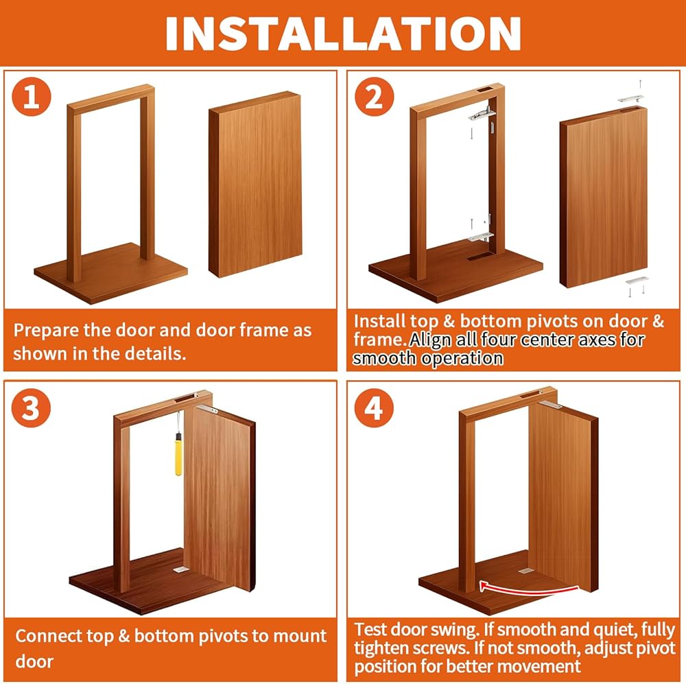 • سهلة التركيب - مع تعليمات التثبيت التفصيلية، فإن مجموعة المفصلات المحورية الخاصة بنا سهلة التركيب، حتى لعشاق الأعمال اليدوية، مع تصميم حواف مستديرة لمزيد من الأمان والراحة أثناء عملية التثبيت.