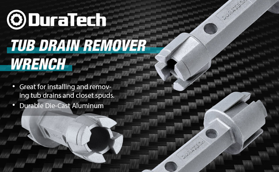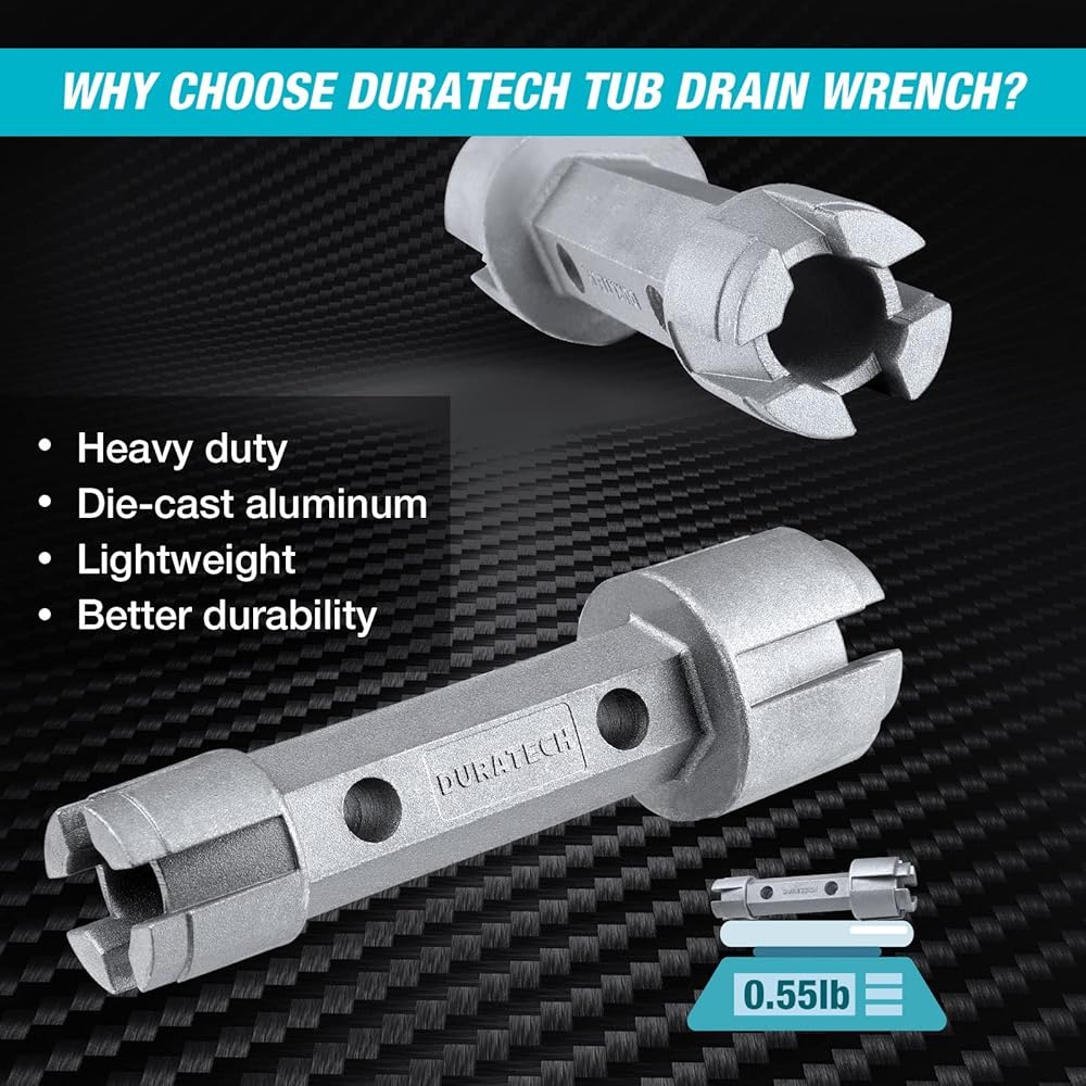 بالمقارنة مع سبائك الزنك، فإن سبائك الألومنيوم أخف بكثير وتدوم لفترة طويلة. يتميز مفتاح ربط مزيل الصرف من DURATECH بتصميم مفتاح ربط مريح لتثبيت وإزالة مصارف الحوض دون خدش التشطيبات الدقيقة. يضمن هذا التصميم الفريد أنه حتى إذا سقط مفتاح الربط عن طريق الخطأ على الحوض أو حوض الاستحمام، فإنه لن يخدش الحوض أو حوض الاستحمام بسهولة