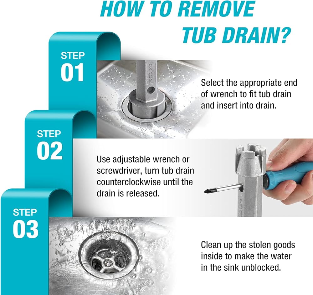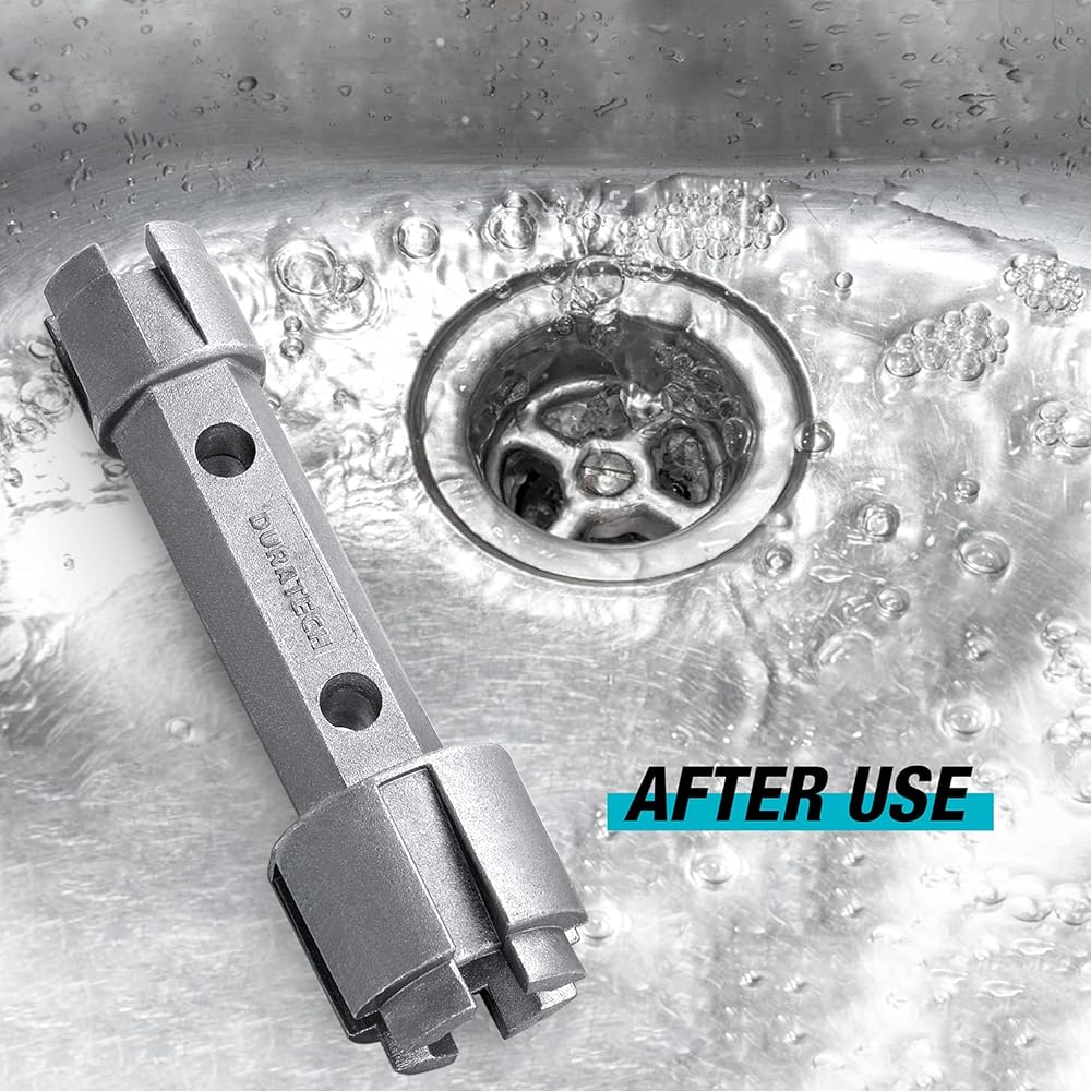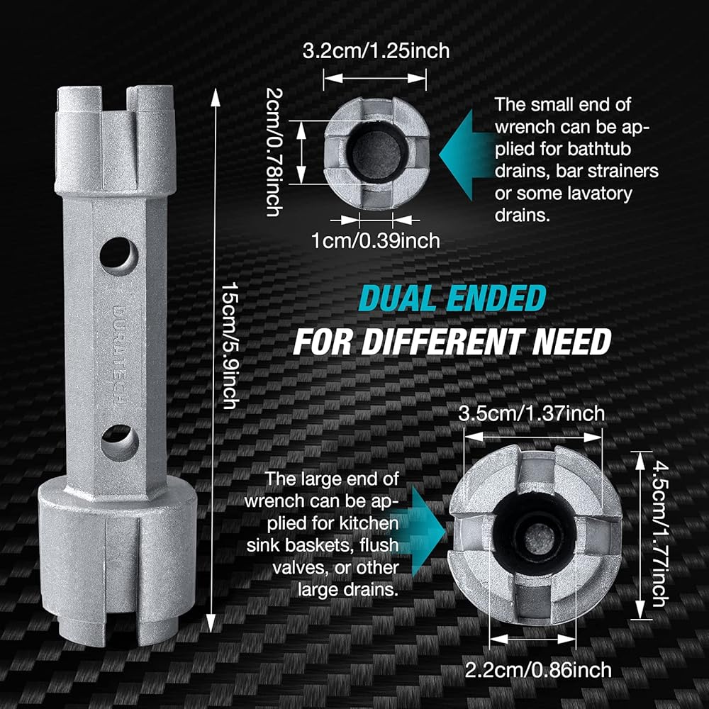 تم تصميم مفتاح تصريف الحوض بجانبين. يمكن استخدام نهاية مفتاح الربط الأكبر لسلال حوض المطبخ، أو صمامات التدفق، أو أنظمة السباكة المنزلية الأخرى؛ يمكن وضع طرف صغير من مفتاح الربط على مصارف حوض الاستحمام ومصفاة القضبان والمزيد. يلبي احتياجاتك اليومية