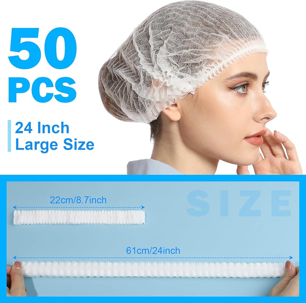 شبكة شعر كبيرة مقاس 24 بوصة من LEOBRO، شبكات شعر للعاملين في خدمات الطعام، شبكات شعر لخدمات الطعام، شبكات شعر المطبخ للنساء والرجال الطبخ، قبعات منتفخة للاستعمال مرة واحدة، غطاء للشعر، 50 قطعة، أبيض