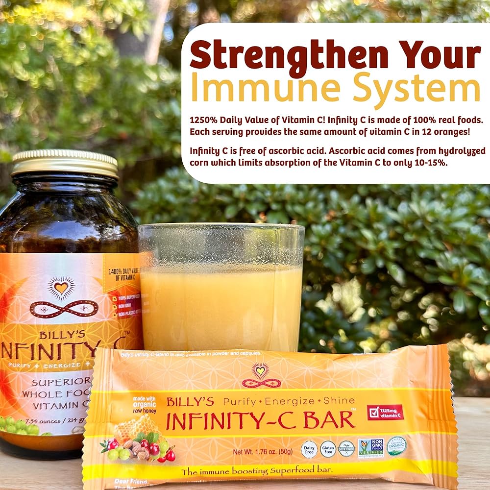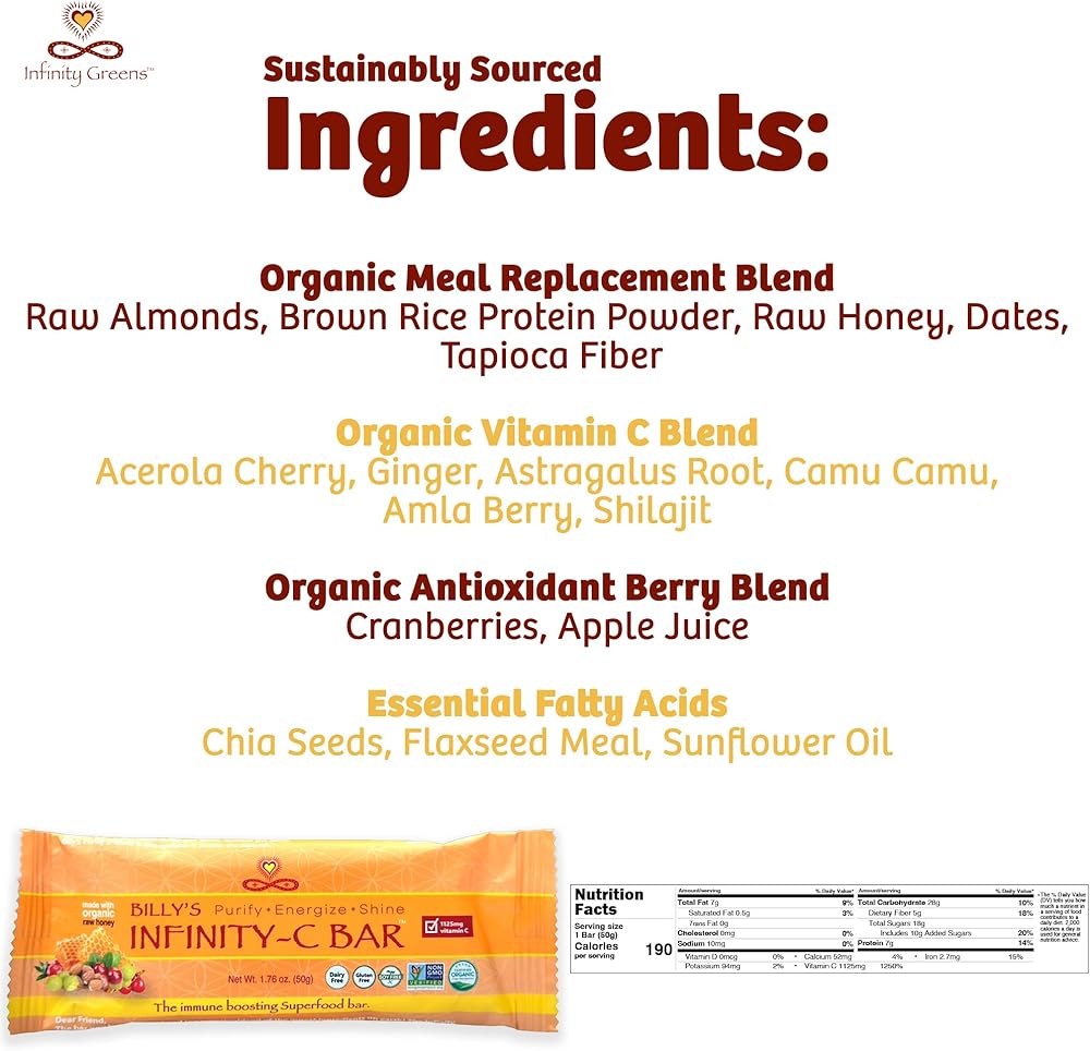 محمل بفيتامين C النباتي: كل قالب للوجبات الخفيفة من Infinity C مليء بـ 1125 مجم من فيتامين C الطبيعي بنسبة 100%. وهذا يمنحك قيمة يومية 1200% من فيتامين C! على عكس العديد من مكملات فيتامين ج المصنوعة من حمض الأسكوربيك الاصطناعي، تحتوي ألواح الطاقة لدينا على فيتامين ج عالي الامتصاص من النباتات الحقيقية بما في ذلك توت أملا وتوت كامو كامو وكرز الأسيرولا.