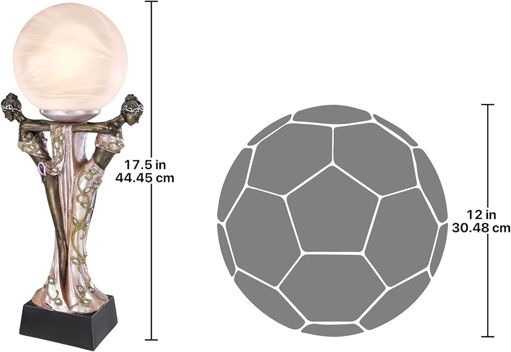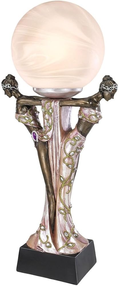 Add a softly romantic, Art Deco-style glow to entryway or boudoir with this classically dramatic illuminated sculpture that pays homage to the revered works of Russian-born sculptor, Erte. True to his concept of feminine beauty, twin maidens in a duo-tone metallic finish sprinkled with tiny faux jewels and golden vines hold aloft a shining 5 -dia. frosted, swirled glass globe. Cast in quality designer resin atop a faux ebony base. Switch on cord; 25-watt bulb.8"Wx5½"Dx17½"H. 3 lbs.