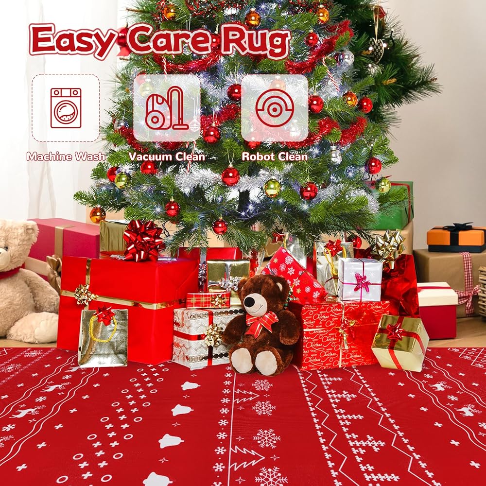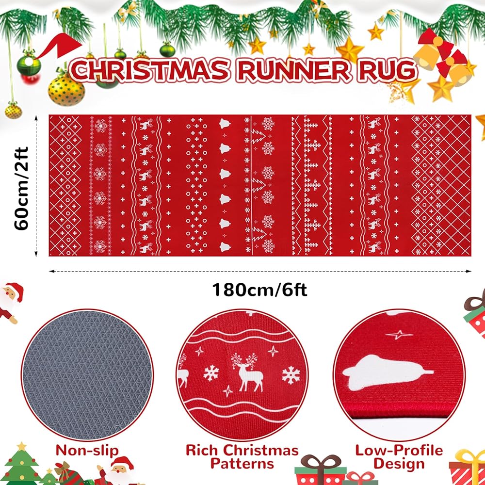 أنماط جميلة: تصميم سجادة عيد الميلاد هذا هو لون أحمر احتفالي مع ندفات الثلج والأيائل والأجراس وأشجار عيد الميلاد، كل منها رمز أساسي لعيد الميلاد، مما يمنح منزلك جو عيد الميلاد