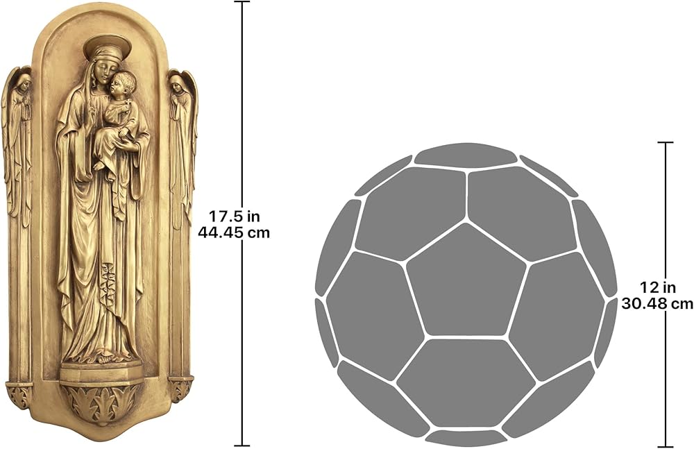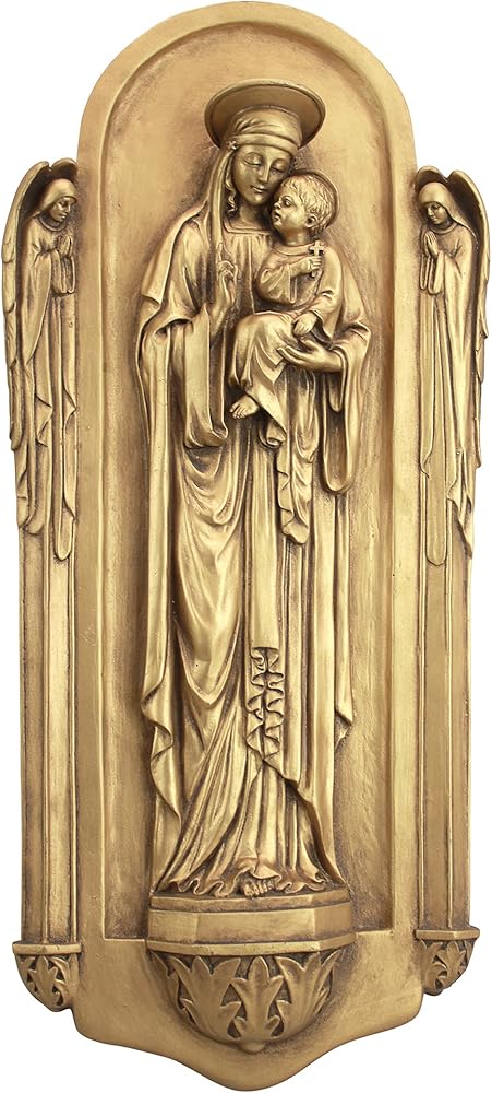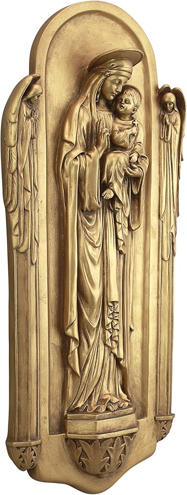 This scaled version of a "reredos, " or rear altarpiece, is found in a beautiful church in Turin, Italy. As with most religious works of its period, it is rich in iconography, depicting the Virgin Mary flanked by two angels and fraught with Gothic styling. Truly memorable in the same rich European tradition that makes most churches living works of religious art, this piece creates an instant sanctuary for meditation in your own home or garden. This Italian-style wall plaque is cast in quality designer resin with a rich antique gold finish to bring out each nuance from angelic halo to feathered wings. Commemorate baptisms, births, anniversaries, weddings, ordinations and other special spiritual occasions with our meaningful statuary collection. 8"Wx2½ "Dx17½ "H. 3 lbs.